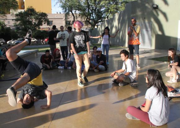 Mientras algunos hacen popping -el famoso baile de robots-, otros hacen breaking, o break dance -disciplina surgida en los 70- contorsionándose con ritmo y audacia. En San Juan esta tribu urbana ocupa el sector detrás de la nueva fuente en la Plaza de la joroba, donde el piso de cemento alisado les permite practicar fácilmente los pasos que surgen del hip hop. Antes se juntaban detrás del Centro de Convenciones, pero la policía los corría del lugar. Ahora, en el remozado espacio verde del corazón de la ciudad, los chicos -que tienen entre 12 a los 25- bailan tranquilos (aunque bajo la atenta mirada policial) al son de la música, que suena en el parlante que lleva uno de ellos.