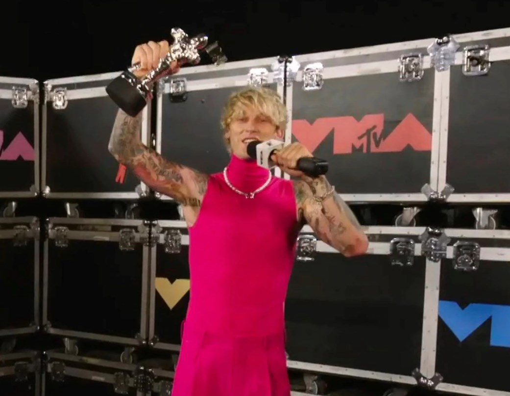 El rapero Machine Gun Kelly fue el centro de atención en su paso por la alfombra roja con un total look rosa de la marca Berluti.