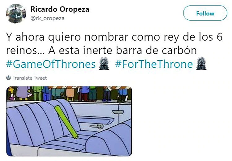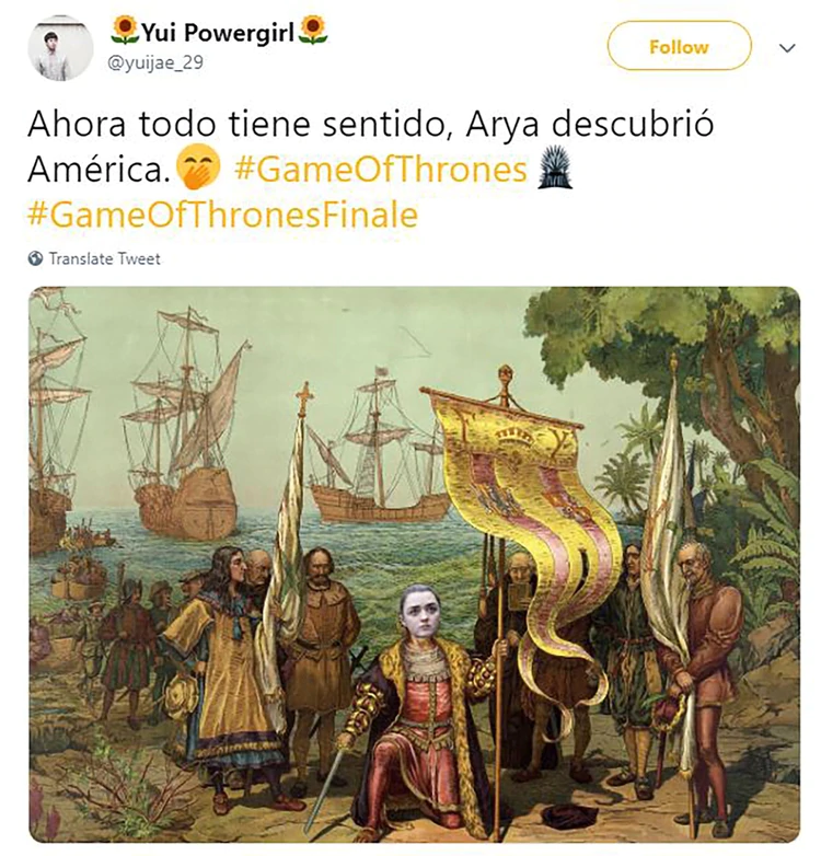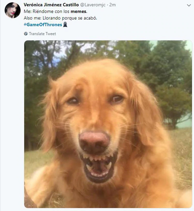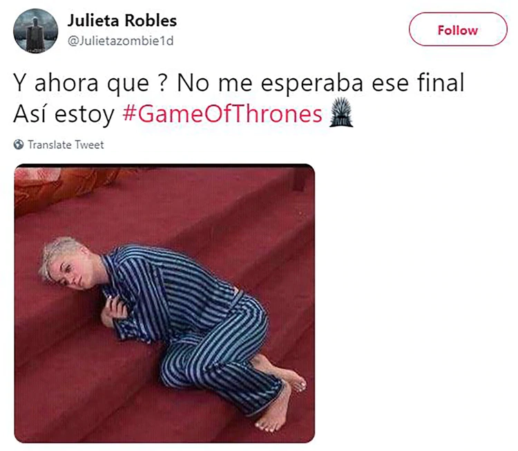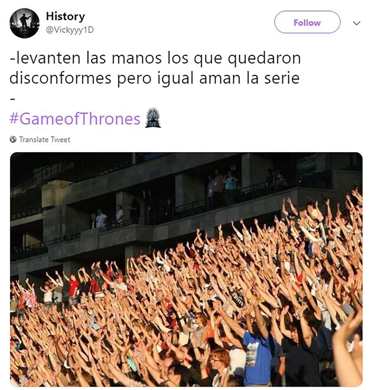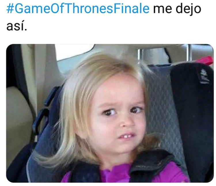 Seguramente pasen muchos años hasta que el final de una serie se viva de la forma en la que se sintió el último episodio deGame of Thrones . La épica de Westeros llegó a su cierre y la historia dejó varias sorpresas a sus espaldas. Y mientras los créditos aparecían en pantalla, los fans del mundo se agruparon alrededor de Twitter para brindar una oleada de memes en los que expresaron con humor las muchas sensaciones que les dejó el adiós a esta popular saga.