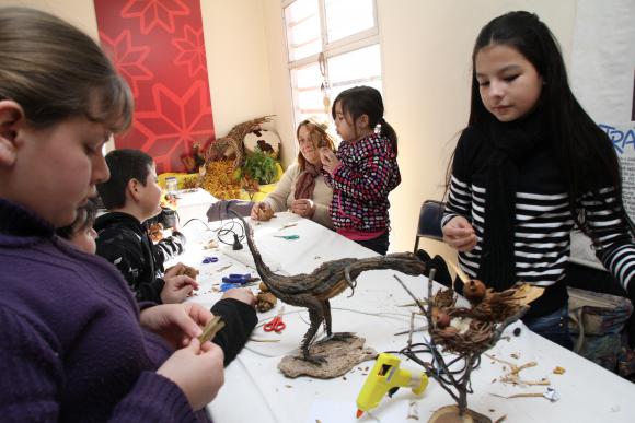 Acompañados por sus padres, que también se ponen manos a la obra, los peques se convierten en expertos artesanos rápidamente y resultados bastante peculiares, como aves, reptiles o dinosaurios. Todo aprovechando la textura, formas y otras características de las semillas, ramas y frutos, que se ensamblan con silicona en caliente.