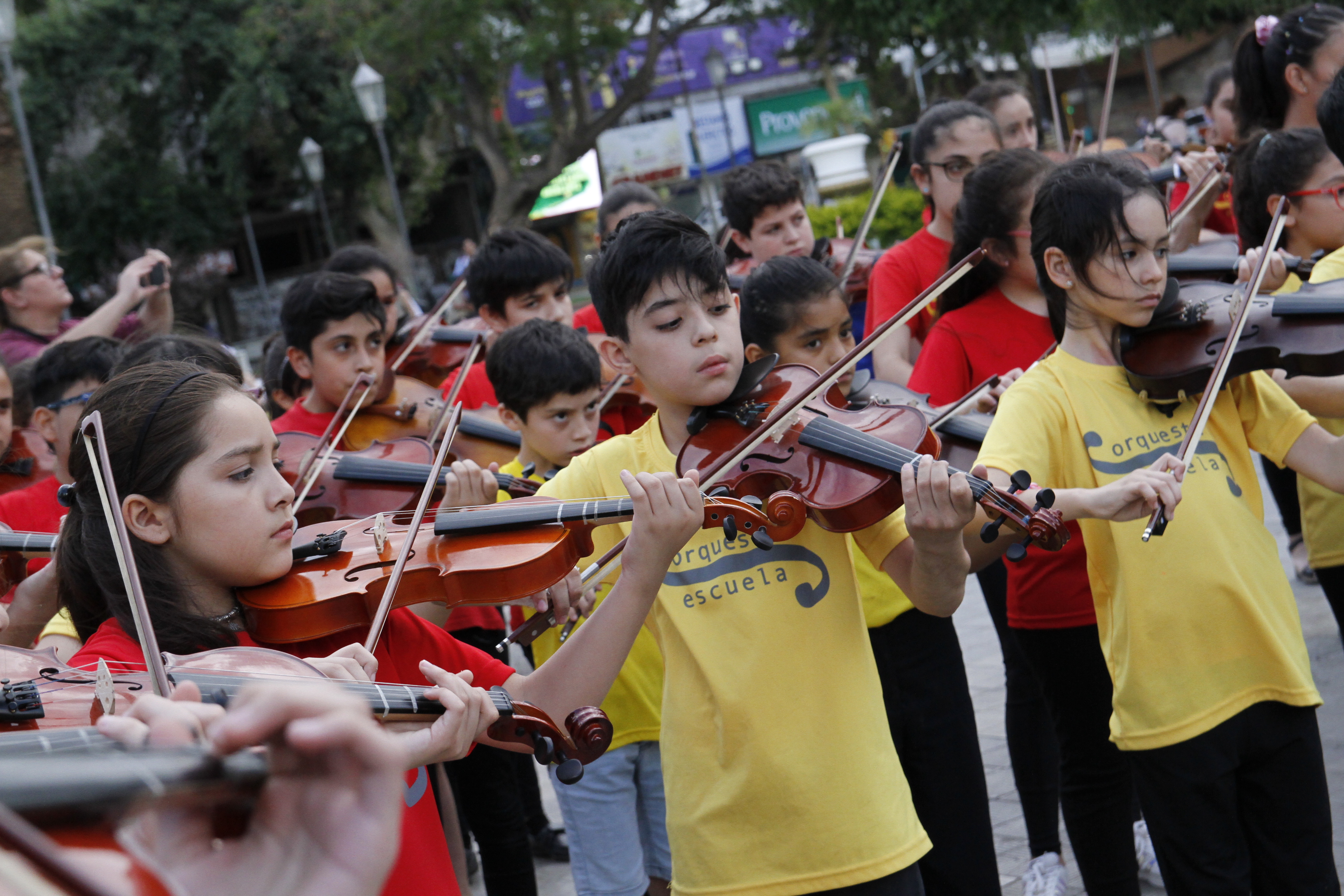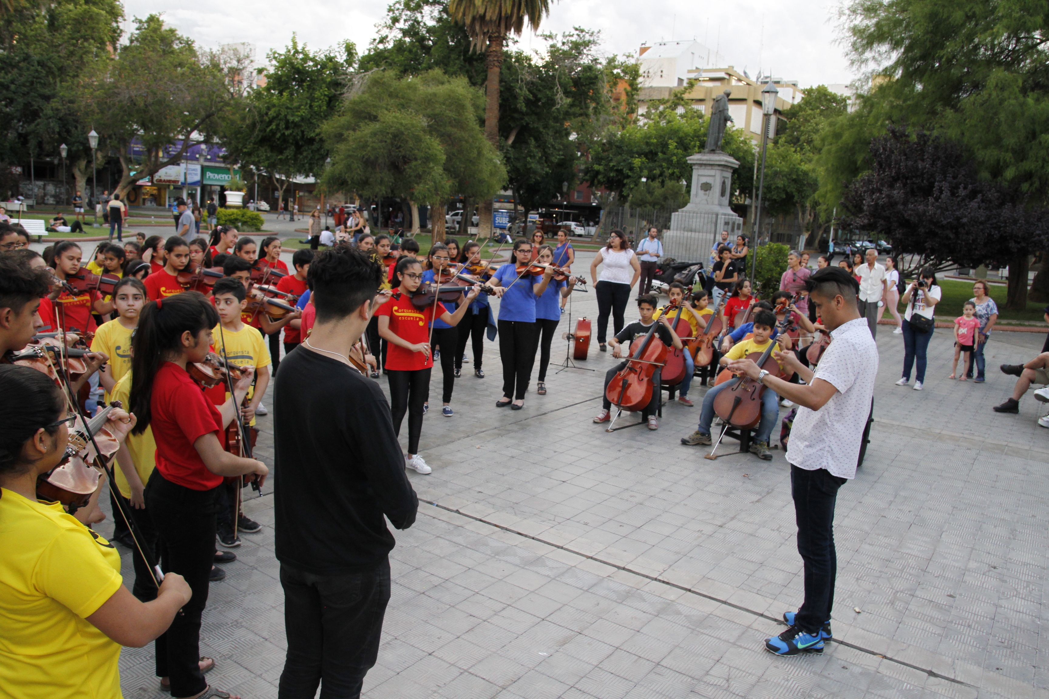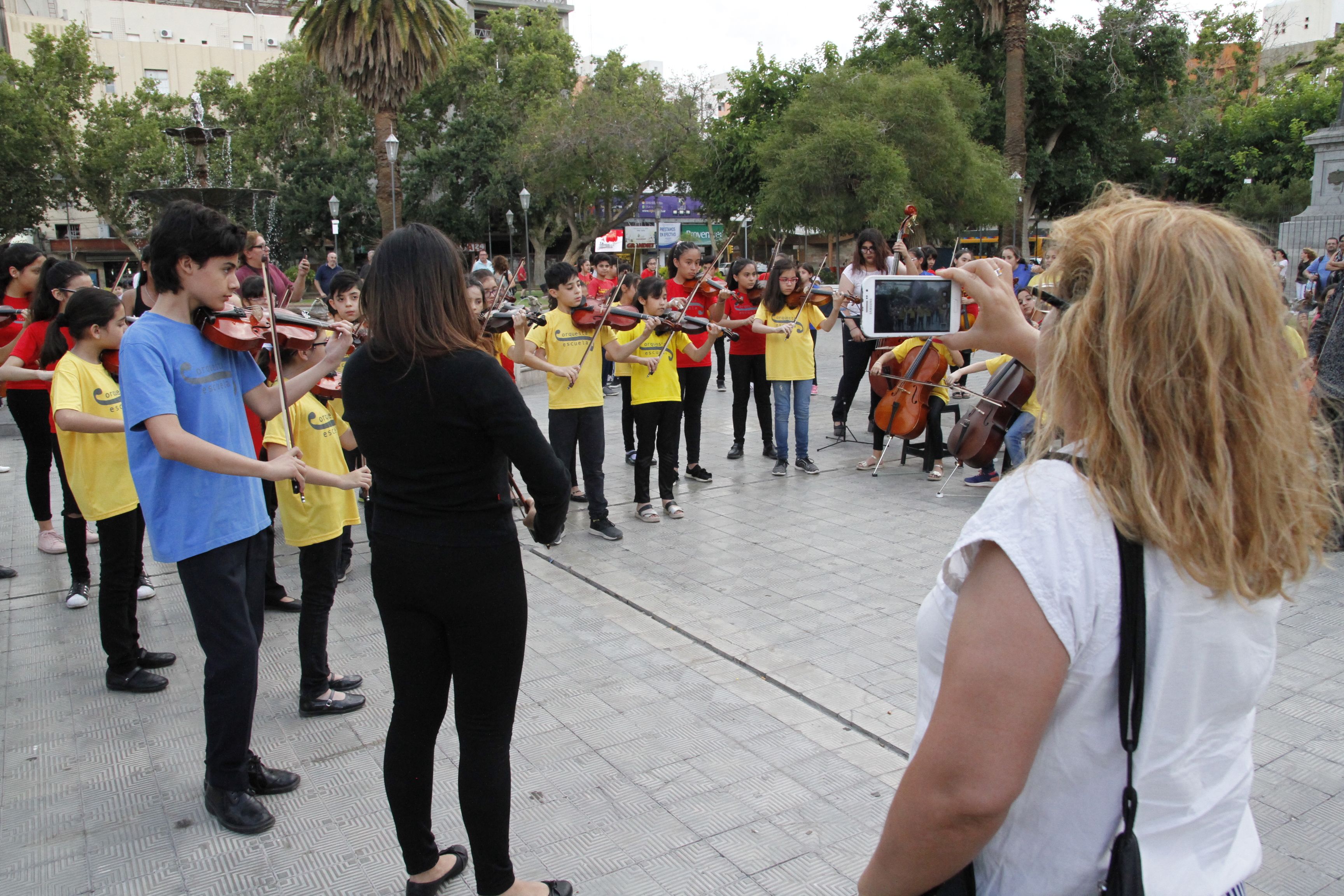 Cuando el clima parecía arruinarse y los nubarrones avisaban de una amenazante tormenta, el cuerpo de 100 niños de la Fundación Orquesta Escuela de San Juan se mantuvo firme con sus instrumentos y se pusieron a tocar en la Plaza 25 de Mayo. Y así fue, ninguno se atemorizó, al contrario, prestaron atención a las indicaciones del profesor Hildemaro Villarreal. Violines, violas, violonchelos y la más reciente adquisición, el contrabajo, dejaron fluir la inmensa energía que tienen los jóvenes para interpretar piezas de la música clásica universal, como también bellas obras populares. La intervención en el espacio público fue en función de promover el concierto a beneficio que viene preparando el programa "A Todo o Nada" de Radio Sarmiento (conducido por Julio Turcumán y Victoria Olaechea, los sábados a las 11) "Por Vos 2018", con más de 100 artistas sanjuaninos en el Teatro del Bicentenario. Lo recaudado de las entradas servirá para financiar la reparación y compra de nuevos instrumentos para la Orquesta Escuela. "Queremos visibilizar el trabajo que viene haciendo la institución integrando cultura y educación. La propuesta vale porque los chicos acceden a la música de manera abierta e integral, que el día de mañana puede ser la profesión que elijan cuando sean adultos", dijo el presidente de la fundación, el profesor Jorge Rodrigo.