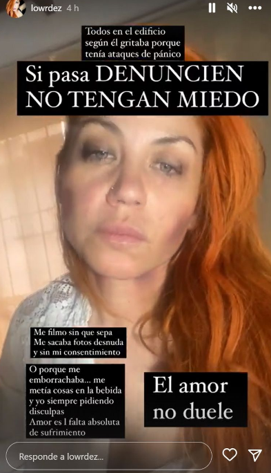 Y continuó “Me filmó sin que yo sepa. Me sacaba fotos desnuda sin mi consentimiento. Me metía cosas en la bebida y yo siempre pidiendo disculpas porque me emborrachaba. Amor es la falta absoluta de sufrimiento. El amor no duele”.