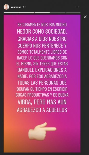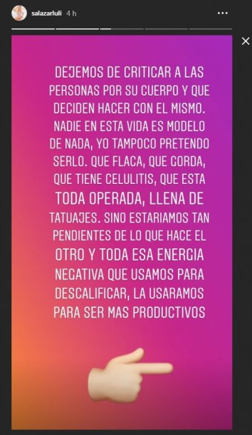 "Que flaca, que gorda, que tiene celulitis, que está toda operada, llena de tatuajes. Sino estuviesen tan pendientes de lo que hace el otro y toda esa energía negativa que usamos para descalificar, la usáramos para ser más productivos seguramente nos iría mucho mejor como sociedad. Gracias a Dios nuestro cuerpo nos pertenece y somos totalmente libres de hacer lo que querramos con el mismo, sin tener que estar dándole explicaciones a nadie", aseguró.