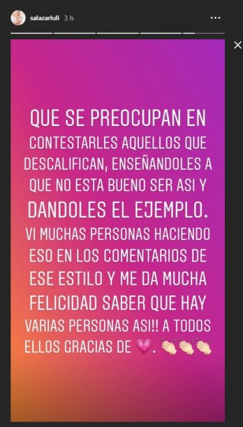 Por la repercusión que generó, Luli decidió escribir una reflexión en sus stories: "Nadie en esta vida es modelo de nada, yo tampoco pretendo serlo".