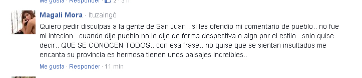 Por eso, casi de inmediato, publicó un mensaje en la cuenta de Facebook de Diario de Cuyo, aclarando sus dichos. "Quiero pedir disculpas a la gente de San Juan.. si les ofendio mi comentario de pueblo.. no fue mi intecion.. cuando dije pueblo no lo dije de forma despectiva o algo por el estilo.. solo quise decir.. QUE SE CONOCEN TODOS.. con esa frase.. no quise que se sientan insultados me encanta su provincia es hermosa tienen unos paisajes increibles..", escribió.