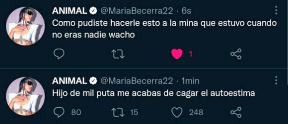 Los tweets de Becerra no terminaron ahí y se mostró más que decepcionada, a través de su cuenta oficial de Twitter: “Gil de mier…, pedazo de garca”.