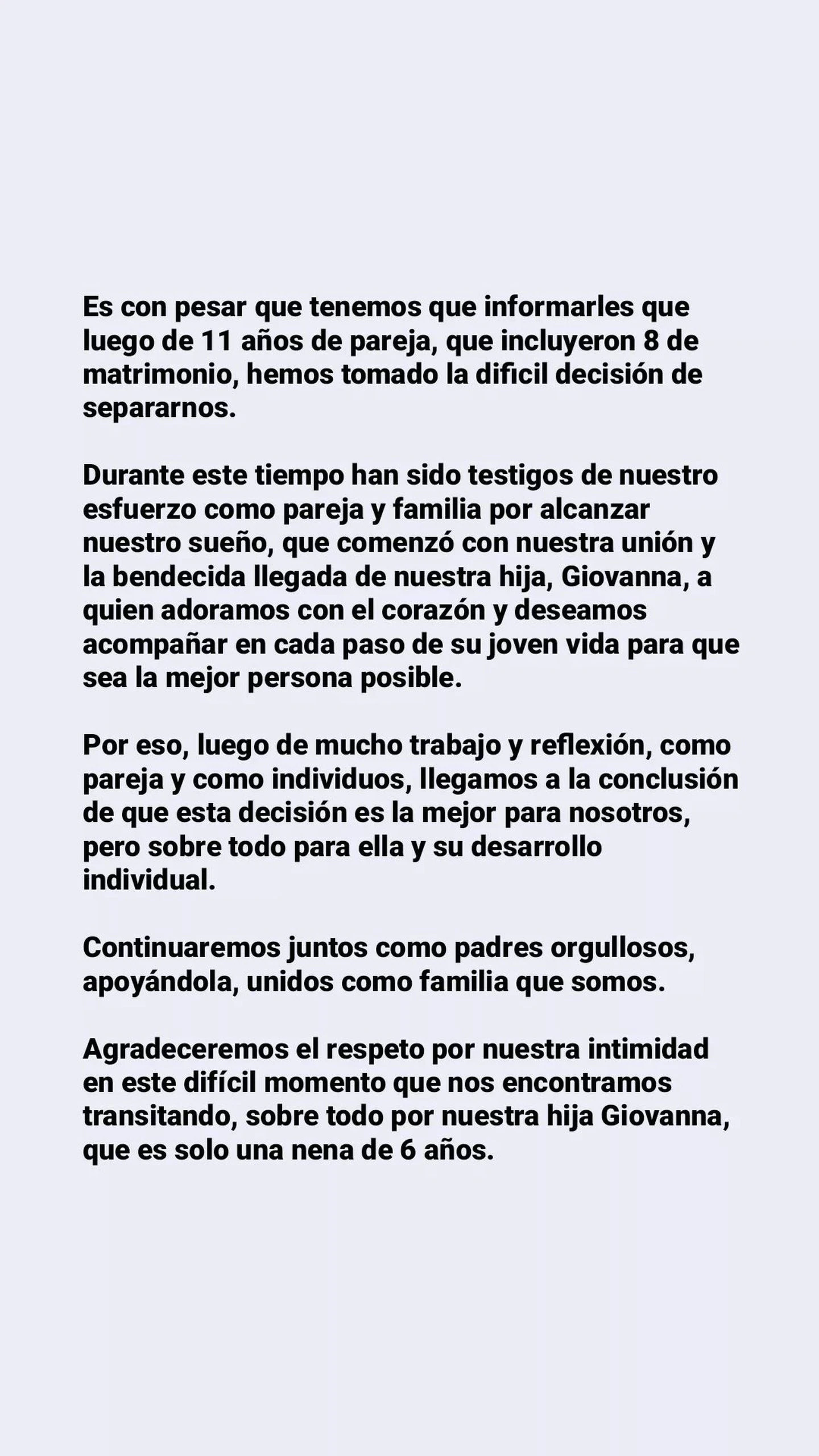 “Hemos tomado la difícil decisión de separarnos. Durante este tiempo, han sido testigos de nuestro esfuerzo como pareja y familia por alcanzar nuestro sueño, que comenzó con nuestra unión y la bendecida llegada de nuestra hija, Giovanna, a quien adoramos con el corazón y deseamos acompañar en cada paso de su joven vida para que sea la mejor persona posible”, expresó la actriz en sus historias de Instagram.