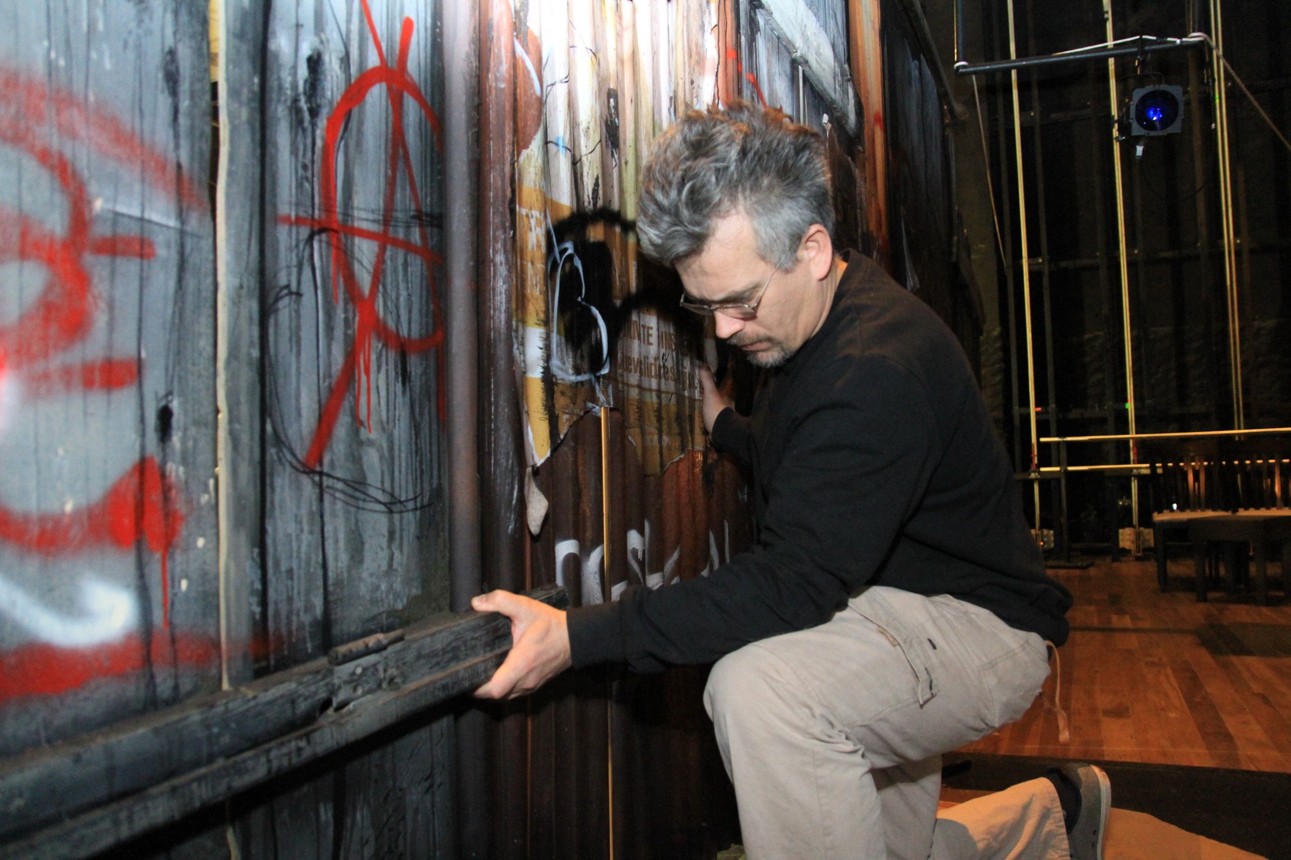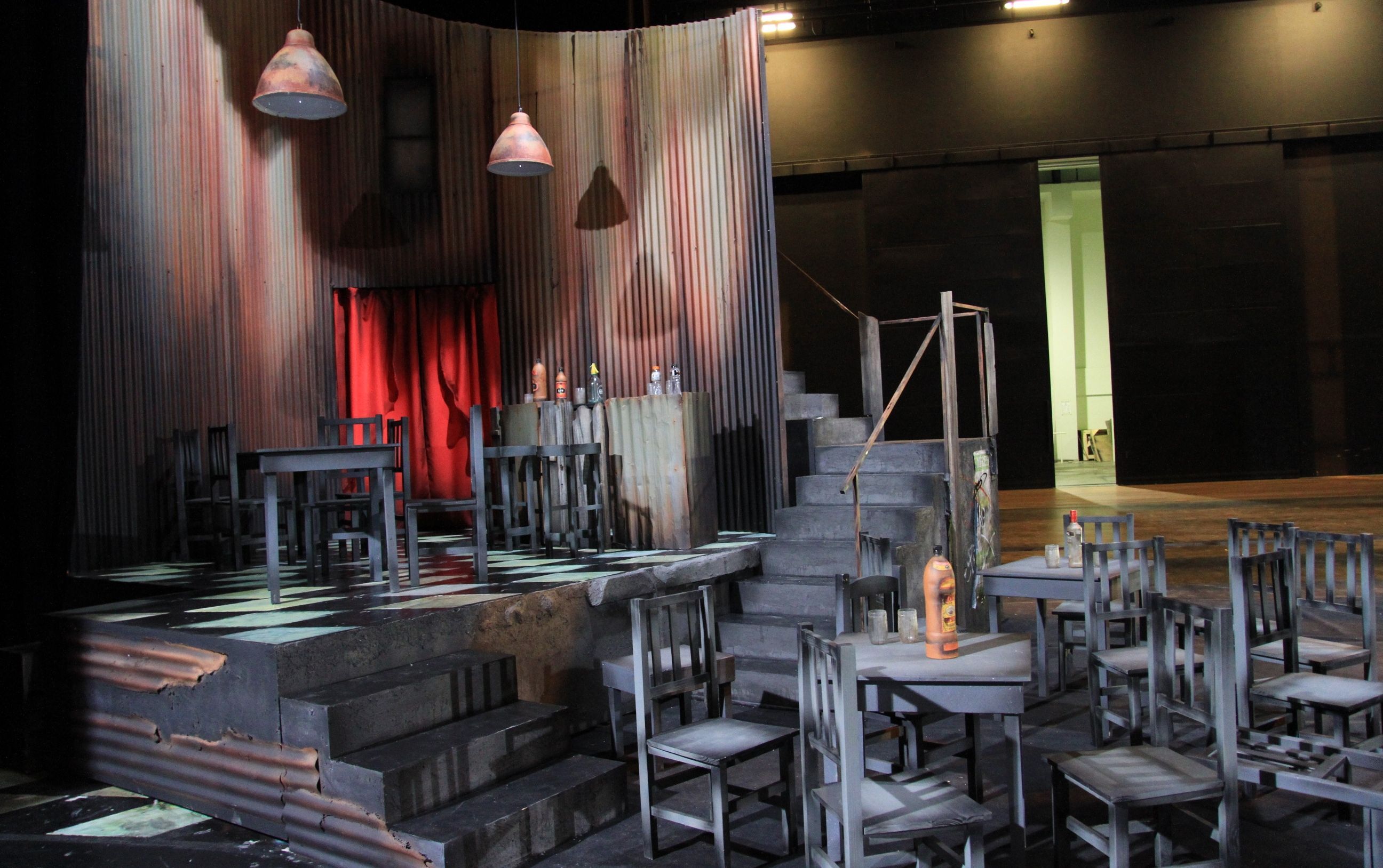 Con la idea de ser transportable, cada pared que da la apariencia de chapa es un módulo de policarbonato con ruedas, y los objetos -como es el caso de las sillas y las mesas- son de MDF, una madera lo suficientemente liviana. Director escenotécnico y encargado del montaje, Sergio Manganelli, explicó que todo empezó a rodar luego que el director presentó los "despiezos", una maqueta con "cada parte de la escenografía".