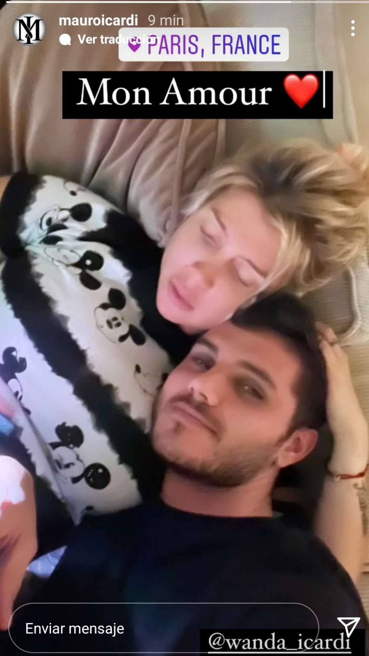 “Mon amour” (que significa “mi amor” en francés), escribió Icardi junto a la foto en la que ella está recostada. La empresaria mediática usa remera con el estampado de Mickey, tiene los ojos cerrados y su mano toca el pelo del deportista que, a su vez, mira a la cámara.