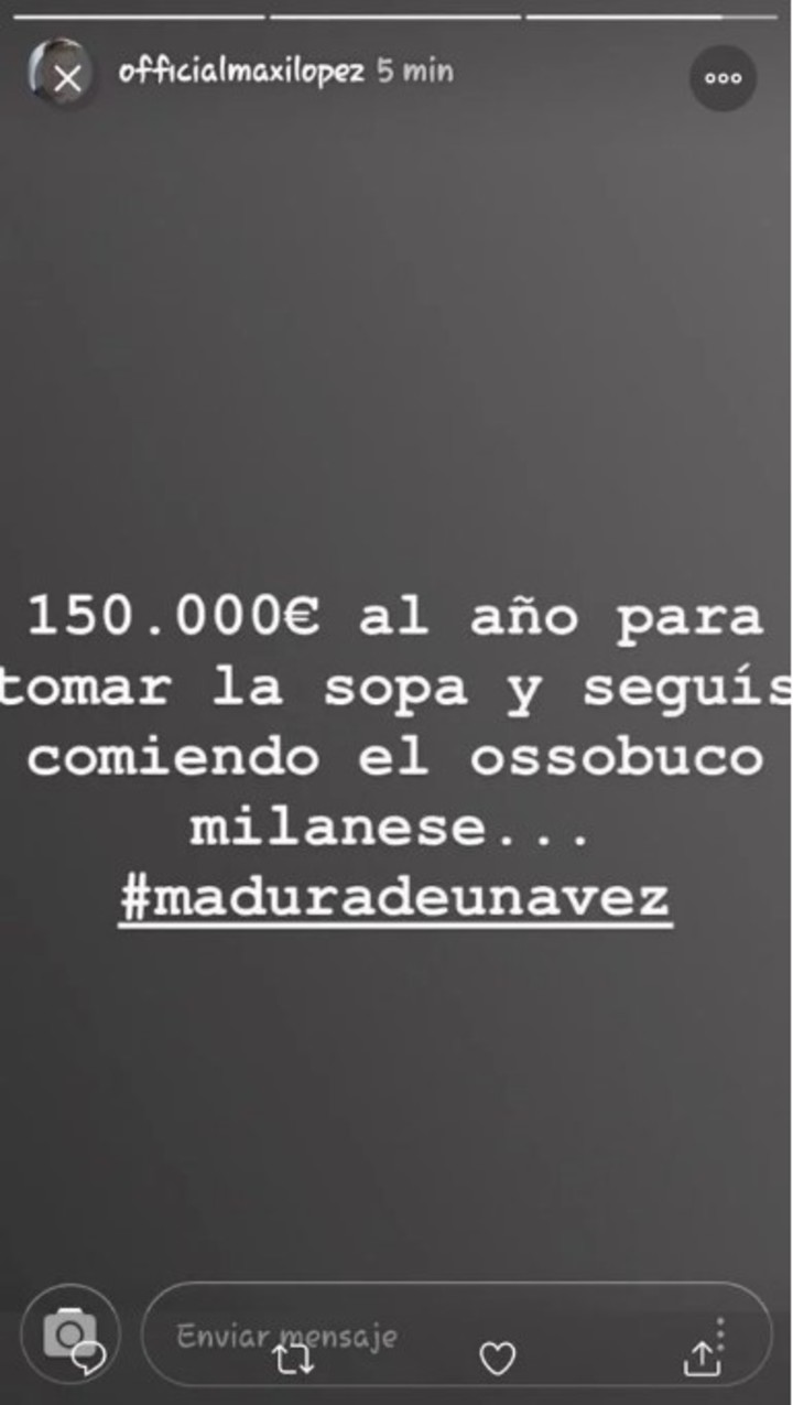 Dicho esto, el mismísimo López también se volcó a las historias de Instagram para defender su nombre y desmentir a su ex mujer."150.000 euros (4.700.000 pesos) al año para tomar la sopa y seguís comiendo el ossobuco milanese… #MaduráDeUnaVez", publicó López.