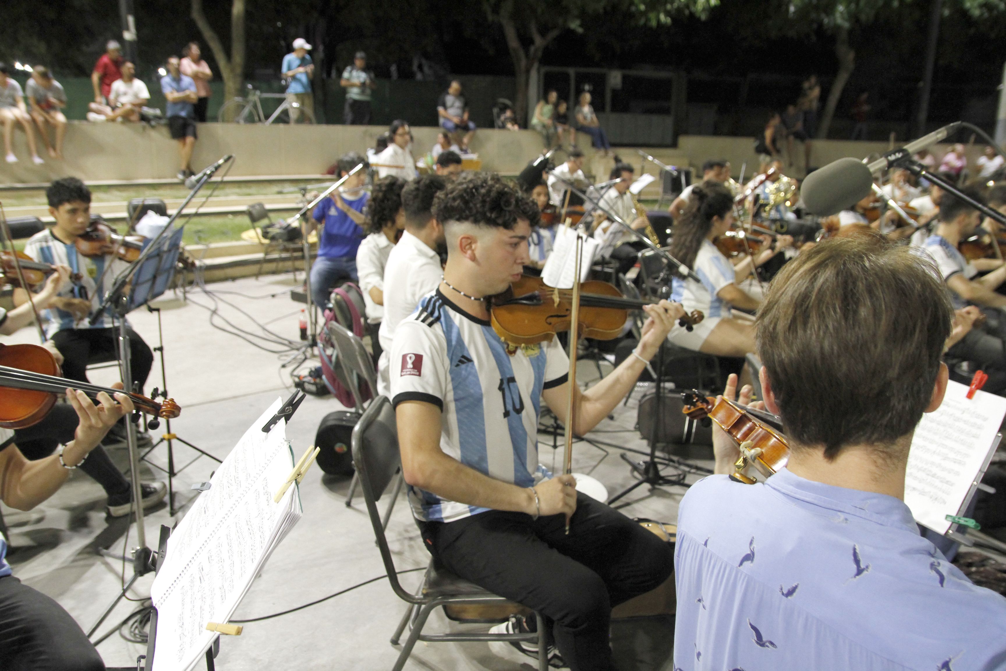 Noche bastante calurosa, aunque reinaba un clima de mucha festividad -tras el triunfo del seleccionado argentino al obtener la copa del Mundial de Fútbol de Qatar- hubo un espacio ideal para celebrar en familia todo este espíritu alegre que reinaba, porque también están las vísperas de la Navidad y Año Nuevo. El escenario fue perfecto, el Anfiteatro del Parque de Mayo, al recibir a un gran ensamble musical integrado por músicos de la Orquesta Sinfónica de la UNSJ, la Camerata San Juan y la Orquesta Escuela de San Juan. El resultado de este combo fue una velada virtuosa, muchos instrumentos, diversos sonidos de cuerdas y metales; muchos jóvenes entusiasmados por tocar obras entretenidas y todo al aire libre. "Navidad en el Parque" fue el título que contuvo toda una propuesta artística, cuyo repertorio fue de música y danza clásica, hasta reconocidos clásicos del rock nacional e internacional. Con el auspicio del Ministerio de Turismo y Cultura, el show fue accesible de manera libre y gratuita para todo tipo de público. No sólo familiares o amistades de los artistas estuvieron presentes, también bastante público casual que se encontraba en la zona se acercaba con sus conservadoras, mate y reposeras y se ubicaron en el semicírculo para verlos y escucharlos con atención. Sonó desde el vals de Shostacovich, pasando por la Danza Eslava de Dvorak y los Toreadores de Bizet. Y por la grilla rockera, con arreglos sinfónicos (de la mano de Enzo Pérez), más la voz invitada de Flor Carmona, pasaron Inconsciente Colectivo de Charly García, Come together de The Beatles, como así también, otros hits de Pappo, Gustavo Cerati y Fito Páez. El ensamble tuvo muchos condimentos, por ejemplo, hubo chicos de 12 años que están dando sus primeros pasos en una orquesta y ante un evento abierto al público, compartiendo filas con otros jóvenes más experimentados y también con músicos ya profesionales. Aunque en la mitad del recital hubo un inconveniente con el sistema de iluminación, que se vio interrumpido por unos minutos, los músicos estuvieron a la altura de las circunstancias y no dejaron de tocar. Con las luces de las linternas de sus pupitres, más las luces de los celulares de los espectadores, la escena a oscuras se convirtió en toda una postal mágica, con la Estrella del Deporte en el centro. En consecuencia, todo el cuerpo artístico tuvo un control de la situación admirable porque a pesar del imprevisto, el show no se detuvo. Esto lo supo valorar la platea y aplaudió con mucha gratitud para los protagonistas. Al final, y para despedirse, sonaron unos villancicos navideños, que con el tema popular "Noche de Paz", dieron por finalizado el encuentro.