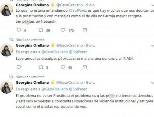 “El problema no es ser prostituta, el problema es que no tenemos derechos y estamos expuestas a constantes situaciones de violencia institucional y estigma social como el que estás reproduciendo vos”, escribió Georgina Orellano, secretaria general de la Asociación de Mujeres Meretrices de Argentina (AMMAR).