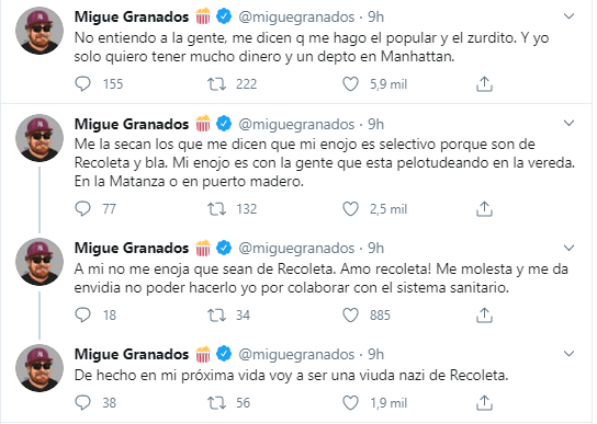 “Me la secan los que me dicen que mi enojo es selectivo porque son de Recoleta y bla. Mi enojo es con la gente que esta pelotudeando en la vereda. En la Matanza o en puerto madero”, agregó. De manera irónica, destacó: “Amo recoleta! Me molesta y me da envidia no poder hacerlo yo por colaborar con el sistema sanitario”.