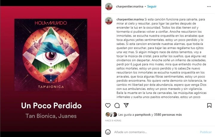 Hoy, martes, Marina volvió a su cuenta de Instagram donde expresó sus sentimientos posteando la letra de "Un poco perdido", el tema de Tan Biónica que contó con la colaboración vocal de Juanes.