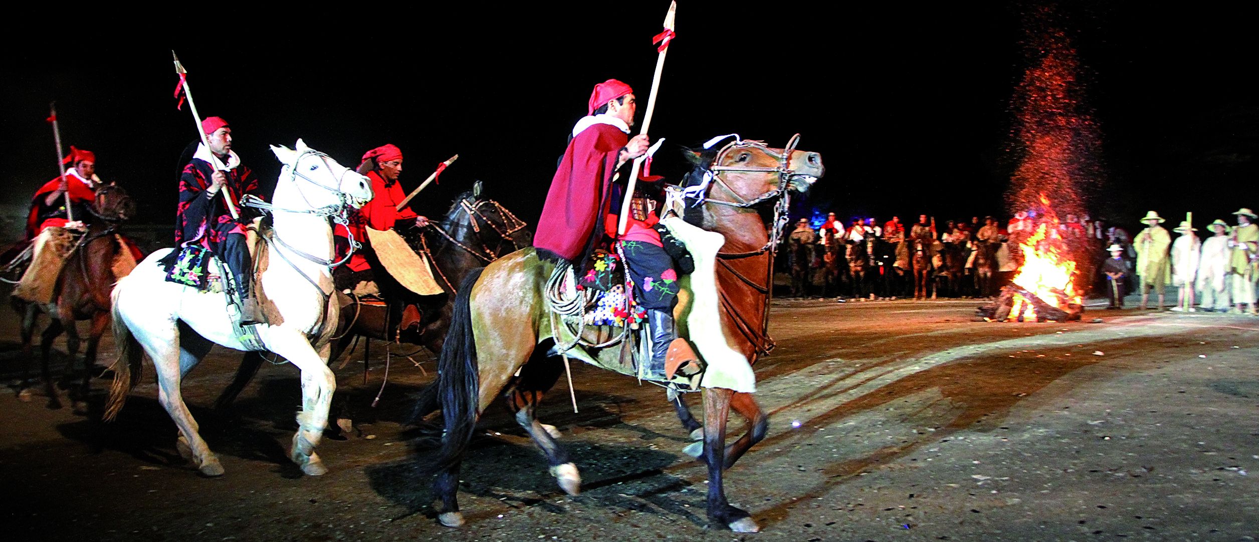 Como todos los años, la Fiesta de la Tradición late al pulso de los sentimientos más caros de la población jachallera y a todos los que viven pasionalmente el folklore. Sobre todo a la hora de revivir el ritual que invoca los versos escritos por Buenaventura Luna: la clásica escenificación del ‘Fogón de los Arrieros’. En este poema de Eusebio Dojorti, se apela al tan anhelado ideal de la unidad latinoamericana (la Patria Grande) y en ese sentido, representa uno de los momentos más esperados por miles de espectadores en cada edición. Bajo una luna llena espléndida que decoraba el paisaje natural de las sierras, los locutores Pascual Recabarren y Mario Echegaray, anunciaron el comienzo del espectáculo. Como introducción, se proyectó un audiovisual con imágenes de grandes caudillos de la historia: Felipe Varela, Facundo Quiroga, Chacho Peñaloza, Miguel Güemes y José de San Martín. Luego, las llamas del fogón se encendieron y las columnas de jinetes, integradas por diferentes agrupaciones tradicionalistas del departamento, representaban a los arrieros de los diferentes rincones del territorio argentino. Desde los tehuelches y calchaquíes, los pamperos y gauchos del norte, del centro y del litoral. Echegaray entonaba las estrofas del poema, a medida que los jinetes se formaban alrededor de las brasas. La más esperada entrada, fue la de Manuel Belgrano, en la que la multitud lo recibía con fuertes aplausos.