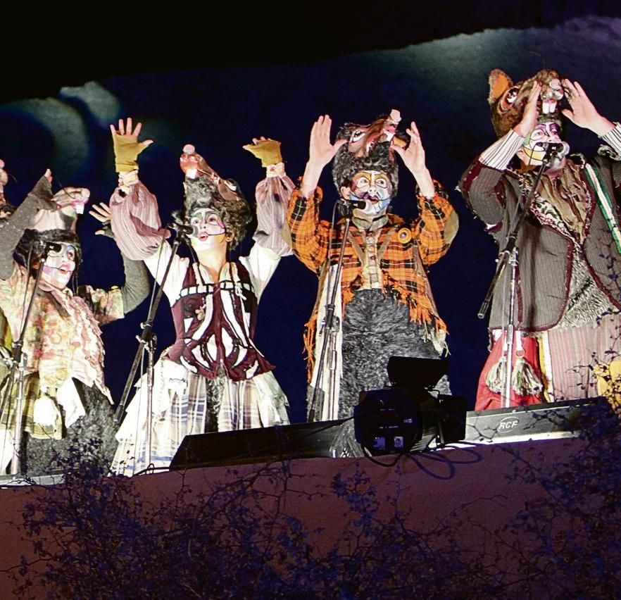 Mientras los asistentes ascendían a la base del cerro, la Orquesta Escuela de San Juan dio la bienvenida con sus sinfonías al caer el sol. Cuando el manto nocturno quedo alumbrado con las estrellas y la luz de la luna creciente, el escenario natural fue ideal por la accidentada formación geológica del Cerro Alcázar iluminada por los proyectores. Sin muchos preámbulos por parte de la presentadora Marcela Podda, Agarrate Catalina entró en acción con las voces en coro y sus rostros pintados de carnaval. El show propuesto fue ‘Un día de Julio’, un espectáculo singular con la historia de Julio, un joven que dedicado a arreglar los artefactos de los vecinos, se opone a la cultura capitalista de una sociedad de consumo y fijada por valores materialistas que anulan y alienan a los individuos. El protagonista, Julio, que solo aspira vivir en el mundo de la ciencia y el conocimiento, huye de tener cualquier contacto con el exterior de su casa, las discusiones políticas con su madre -que quiere que de una vez se emancipe, madure y consiga trabajo-; el cuadro coreográfico con las ratas, las couplés y los extravagantes trajes, fueron algunos puntos fuertes en que se apoya la trama de una historia que profundiza la crítica social, lo absurdo de la vida cotidiana y las relaciones humanas. La murga charrúa con su ácido humor, el estilo rioplatense de la batucada y el repique, no dejó respiro a los animados espectadores para descansar de reír.