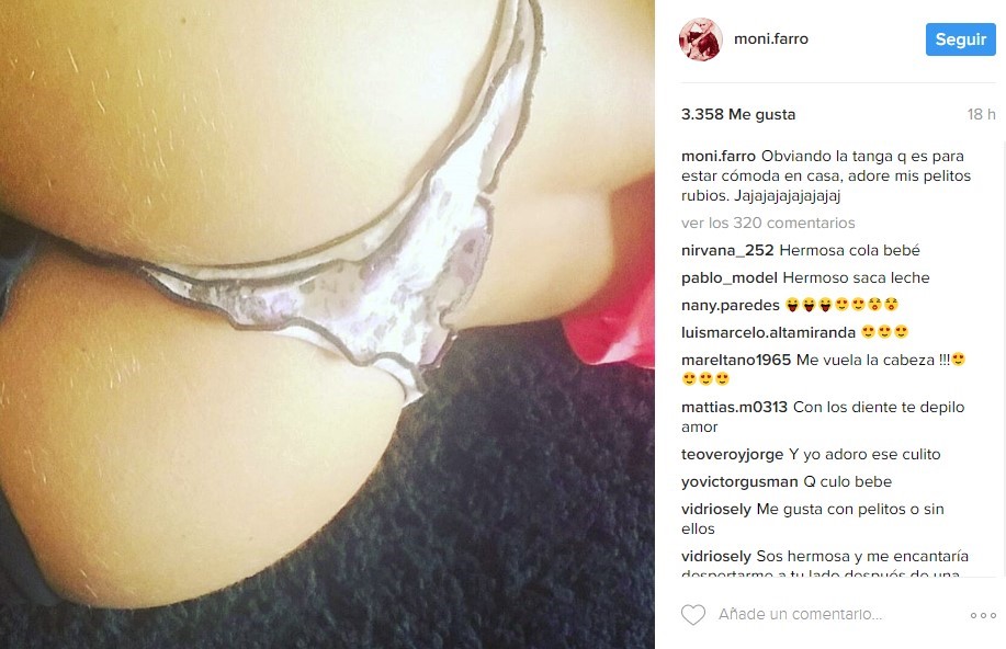 Junto a la atrevida postal 2.0 la vedette del espectáculo Cocodrilo, la revista expresó con emoción su opinión sobre esa exuberante parte de su cuerpo. "Obviando la tanga que es para estar cómoda en casa, adoré mis pelitos rubios Jajajajajajajajaj", escribió la Farro, tal como se la conoce a Mónica de esta parte del charco.