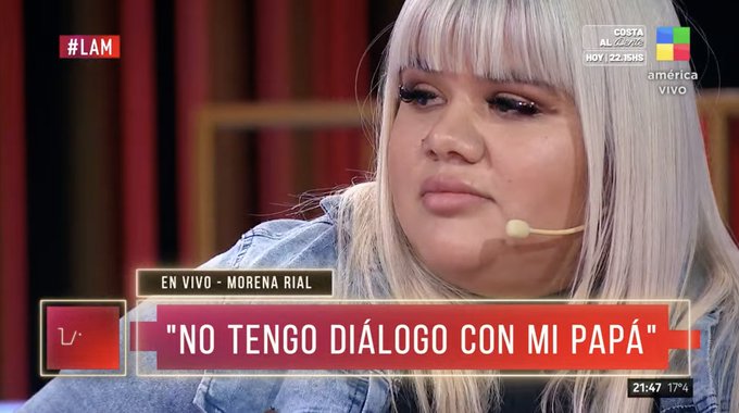Morena Rial estuvo invitada a LAM (América, a las 20), el ciclo que conduce Ángel De Brito. Allí, la hija de Jorge Rial declaró que no tiene diálogo con su padre desde que él volvió de Colombia, donde sufrió un infarto que lo dejó al borde de la muerte. De hecho, su corazón se detuvo durante diez minutos y tuvo que ser reanimado.