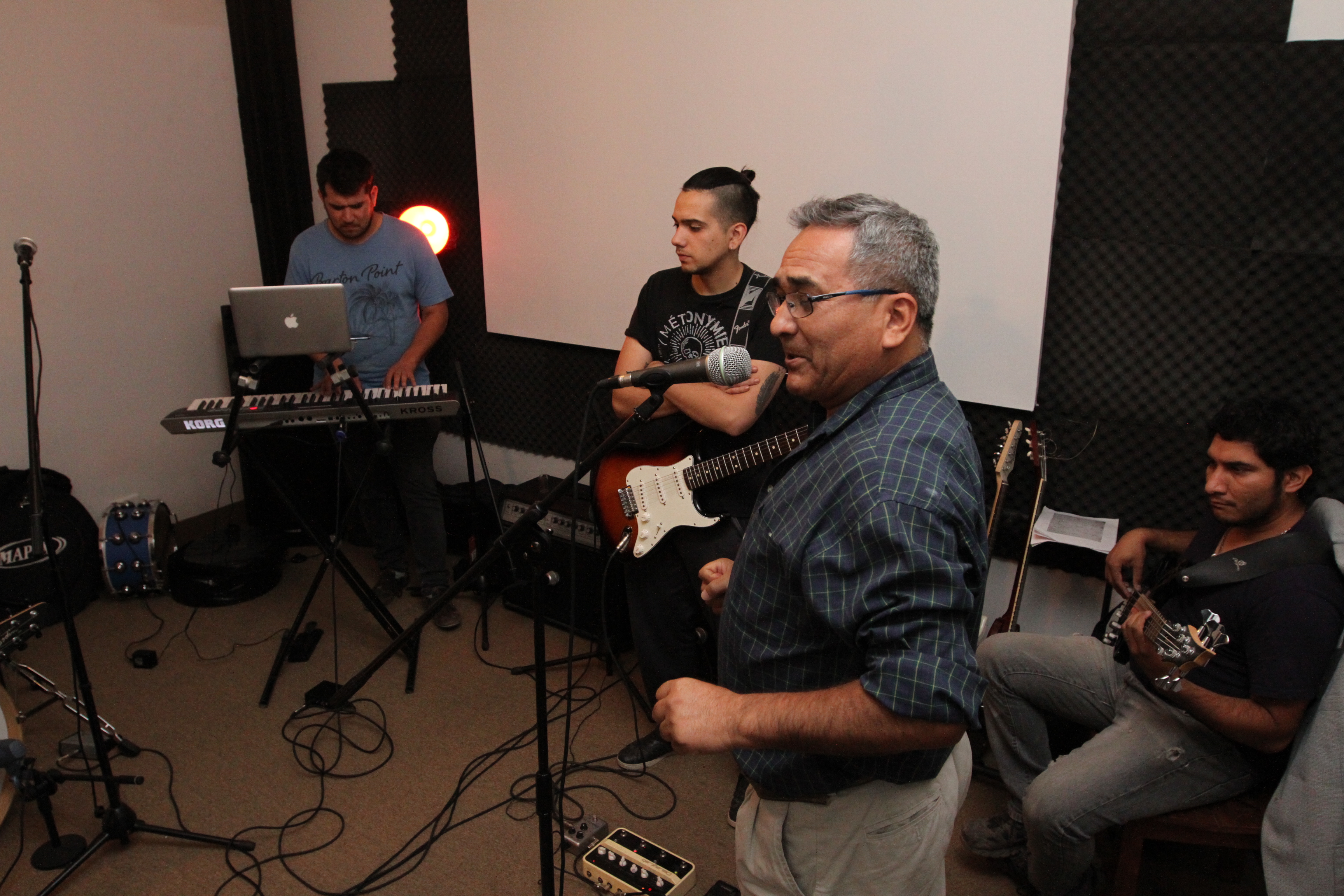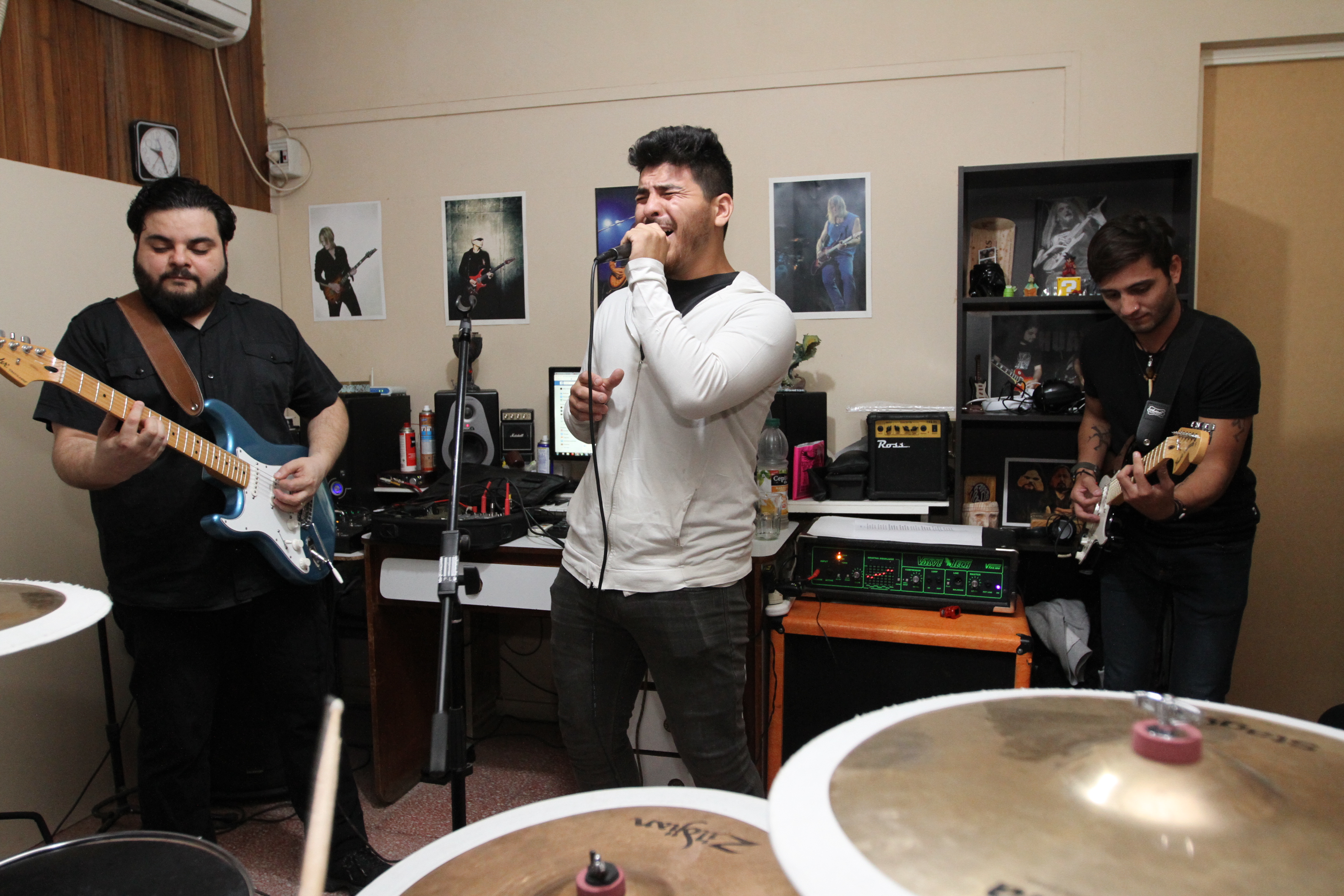 Willy Herrera en guitarra, con Marcos Lozano en el micrófono y Agustín Días en el bajo, ensayan el hit "Rosa Rosa".