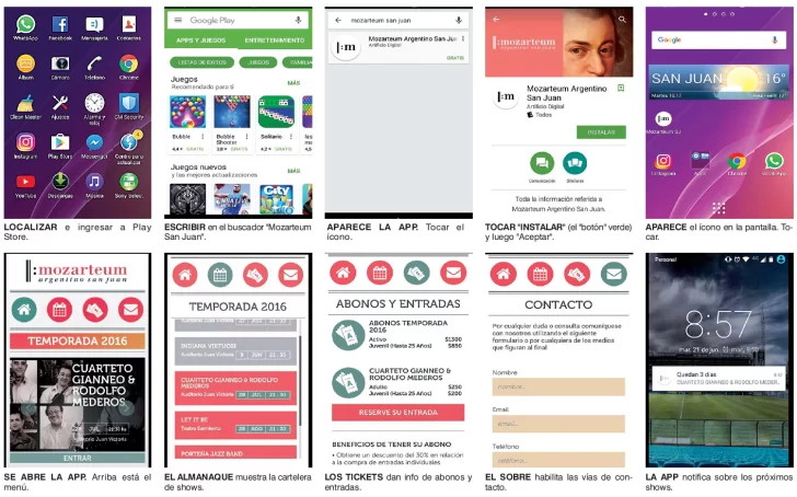 ¿Cuál es la próxima función de Mozarteum San Juan? ¿A qué hora? ¿Cómo puedo reservar los tickets? ¿Cuánto cuestan? Todas esas respuestas, y otras más, están ahora a un ‘touch’ (toque), ya que la institución acaba de lanzar su propia app (aplicación), que cualquier interesado -abonado o no a la temporada en curso- podrá descargar gratuitamente en sus smartphones con sistema Android, a través de la ‘Play Store’ de Google; en una iniciativa inusual en lo que respecta a estas instituciones culturales en la provincia.