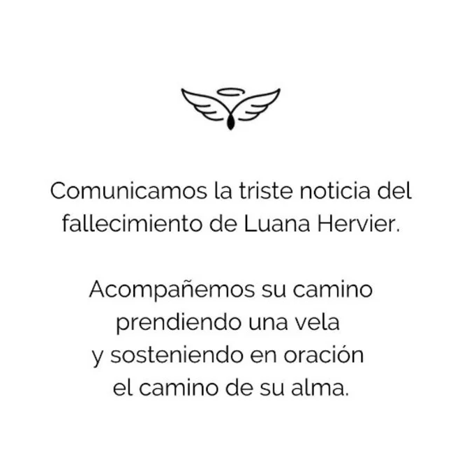 En la foto de Instagram, en donde tenía más de 100 mil seguidores, puede leerse: “Comunicamos la triste noticia del fallecimiento de Luana Hervier. Acompañemos su camino prendiendo una vela y sosteniendo en oración el camino de su alma”.