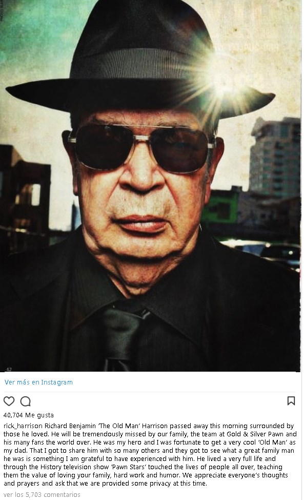 Richard Harrison, conocido como "El viejo" en el programa El precio de la historia, en español, murió este lunes a los 77 años, informó su hijo, Rick Harrison, a través de Instagram.
