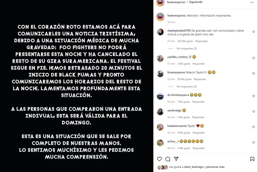 “La familia Foo Fighters está devastada por la trágica y prematura pérdida de nuestra querido Taylor Hawkins. Su espíritu musical y su risa contagiosa vivirán con todos nosotros para siempre”, se puede leer en el mensaje.