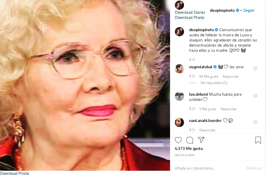 "Comunicamos que acaba de fallecer la mamá de Lucia y Joaquin, ellos agradecen de corazón las demostraciones de afecto y respeto hacia ellos y su madre. QEPD", dice el escueto comunicado que difundieron los hermanos Galán.
