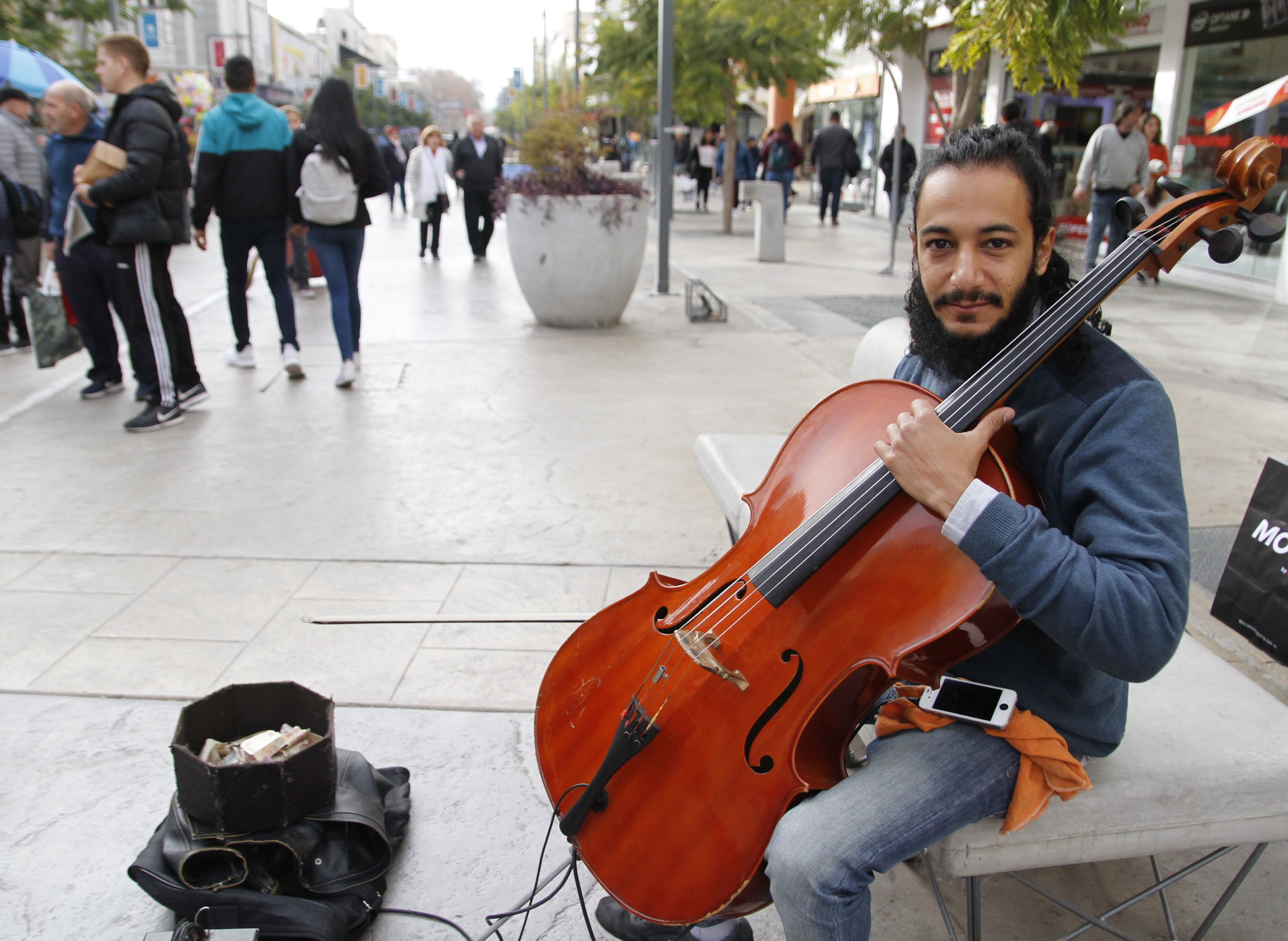 ¡Qué buena versión hermano, Te felicito! Se acerca y le dice un hombre joven de acento norteño, y él responde con un gracias y una gran sonrisa. La peatonal está cubierta con un cielo plomizo, el frío cala los huesos de los transeúntes que la caminan arropados y apurando el paso. Pero varios se detienen un momento a escucharlo a él, lo aplauden, le agradecen con una sonrisa; y los que pueden, con algo de dinero que dejan en el estuche. Sentado en un banquito, abrazado a su cello, su música -que alcanza varios metros a la redonda- es un cálido oasis para el público ocasional. Y es que no es de lo más común escuchar música clásica y tango, con ese instrumento y tan bien ejecutado, en la vía pública. Se llama Germán Yanes, tiene 28 años y llegó desde su Venezuela natal a Argentina hace 6 años, cuando vio que la realidad económico-social de su país se les hacía insostenible. Luego de vivir en Buenos Aires, un destino que vio "hermoso’ para la música y donde el tango lo "atrapó fuertemente’, el artista que en los veranos aprovecha para moverse a otros lugares como Uruguay, la Patagonia argentina y Chile llegó a la provincia movilizado por un amor que "ya no más’ -comentó con un dejo de pena-.