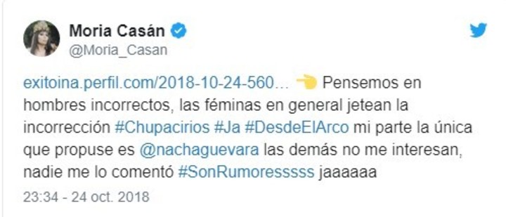 Desafiante, la "one" había publicado en sus redes: "Pensemos en hombres incorrectos. Las féminas, en general, jetean la incorrección #ChupaCirios #Ja #DesdeElArco". A la única que propuse es a Nacha Guevara. Las demás no me interesan, nadie me lo comentó #SonRumoresssss, jaaaaaa", agregó, como respuesta a los nombres de Viviana Canosa, Claudia Fontán y Soledad Silveyra, que se estaban instalando como las posibilidades más fuertes.