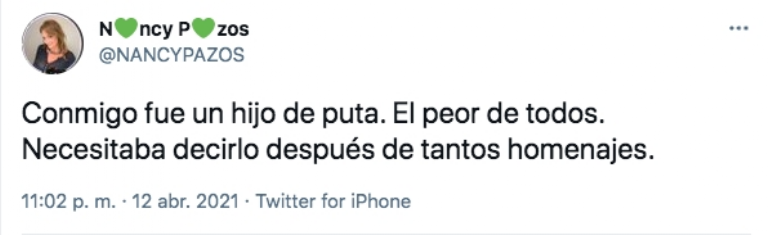 Pero, Nancy Pazos decidió usar su cuenta de Twitter para disparar una fuerte denuncia contra el periodista. "Conmigo fue un hijo de puta. El peor de todos. Necesitaba decirlo después de tantos homenajes", lanzó la panelista.