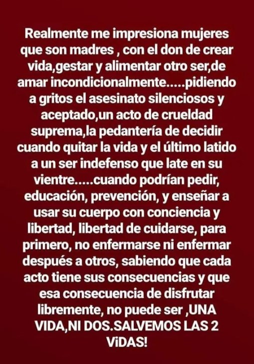 "Realmente me impresiona, mujeres que son madres, con el don de crear vida, gestar y alimentar otro ser, de amar incondicionalmente pidiendo a gritos el asesinato silencioso y aceptado. Un acto de crueldad suprema, la pedantería de decidir cuándo quitar la vida y el último latido a un ser indefenso que late en su vientre, cuando podrían pedir educación, prevención y enseñar a usar su cuerpo con conciencia y libertad. Libertad de cuidarse, para primero no enfermarse ni enfermar a otros, sabiendo que cada acto tiene sus consecuencias y que esa consecuencia de disfrutar libremente no puede ser una vida ni dos. ¡Salvemos las dos vidas!", escribió en sus stories de Instagram.