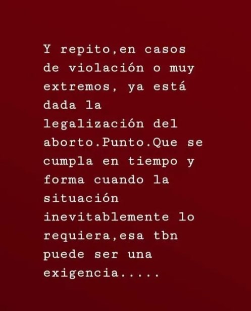 "Y repito, en casos de violación o muy extremos ya está dada la legalización del aborto. Punto. Que se cumpla en tiempo y forma cuando la situación inevitablemente lo requiera. Esa también puede ser una exigencia", agregó.