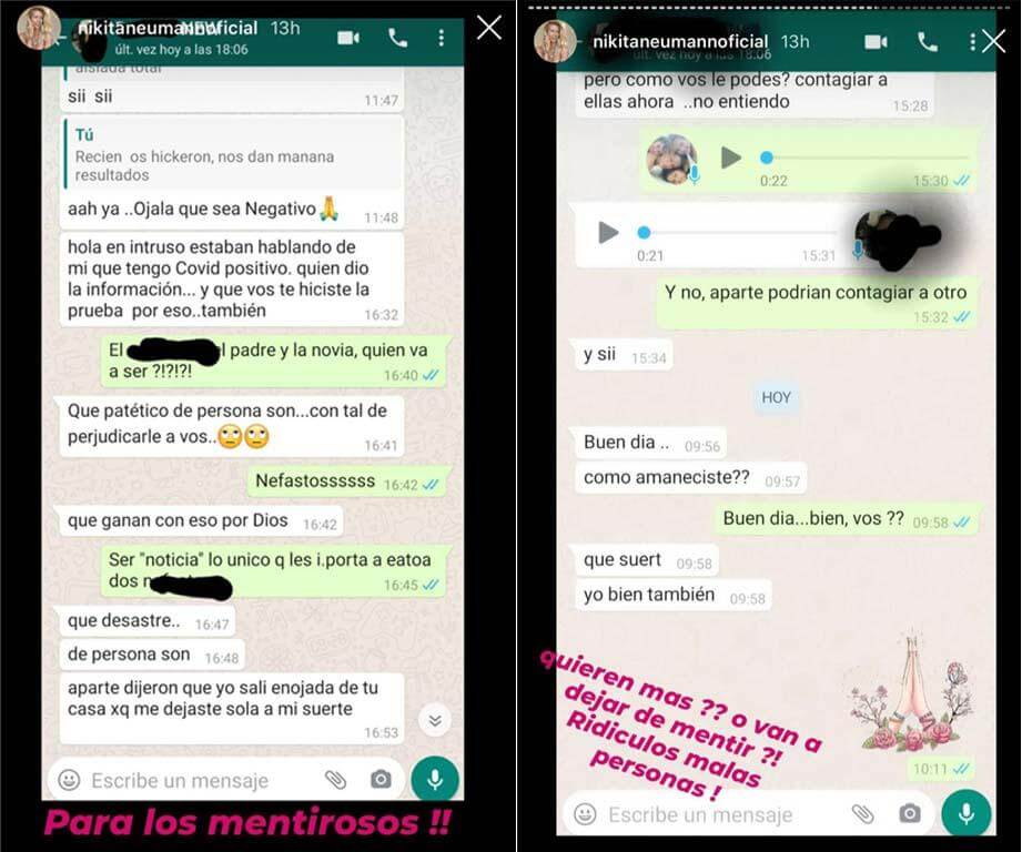 En Intrusos aseguraron que la familia de la empleada estaba indignada con la modelo por esta actitud y Nicole salió a responder. En Instagram mostró los mensajes que intercambió con la mujer días antes de que se confirmara su propio positivo, en los que se sugiere una relación cordial.
