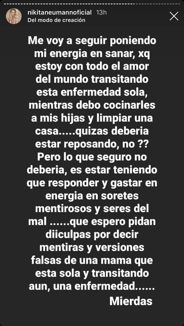 En otro posteo, Nicole escribió un texto furioso en donde pide más empatía y cuenta que, desde ahora, focalizará su energía en recuperarse. "Lo que seguro no debería es estar teniendo que responder y gastar mi energía en sor… mentirosos y seres del mal, que espero pidan disculpas por decir mentiras y versiones falsas de una mamá que está transitando aún una enfermedad. Mierd…"