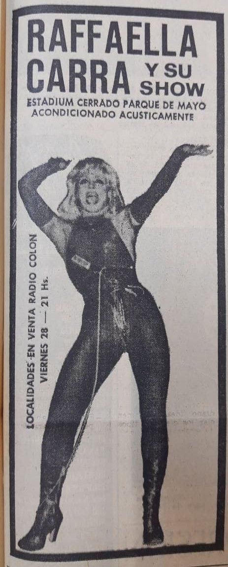 "La llegada de la estrella está anunciada para mañana por vía aérea. Los organizadores han previsto un importante recibimiento que consistirá en la composición de una caravana que se iniciará en el aeropuerto Internacional Las Chacritas. Posteriormente Raffaella Carrá recibirá a los periodistas locales", decía DIARIO DE CUYO, que resaltaba la "inusitada expectativa por esa presentación", para la cual días antes habían llegado dos equipos en camiones y el staff técnico y artístico.