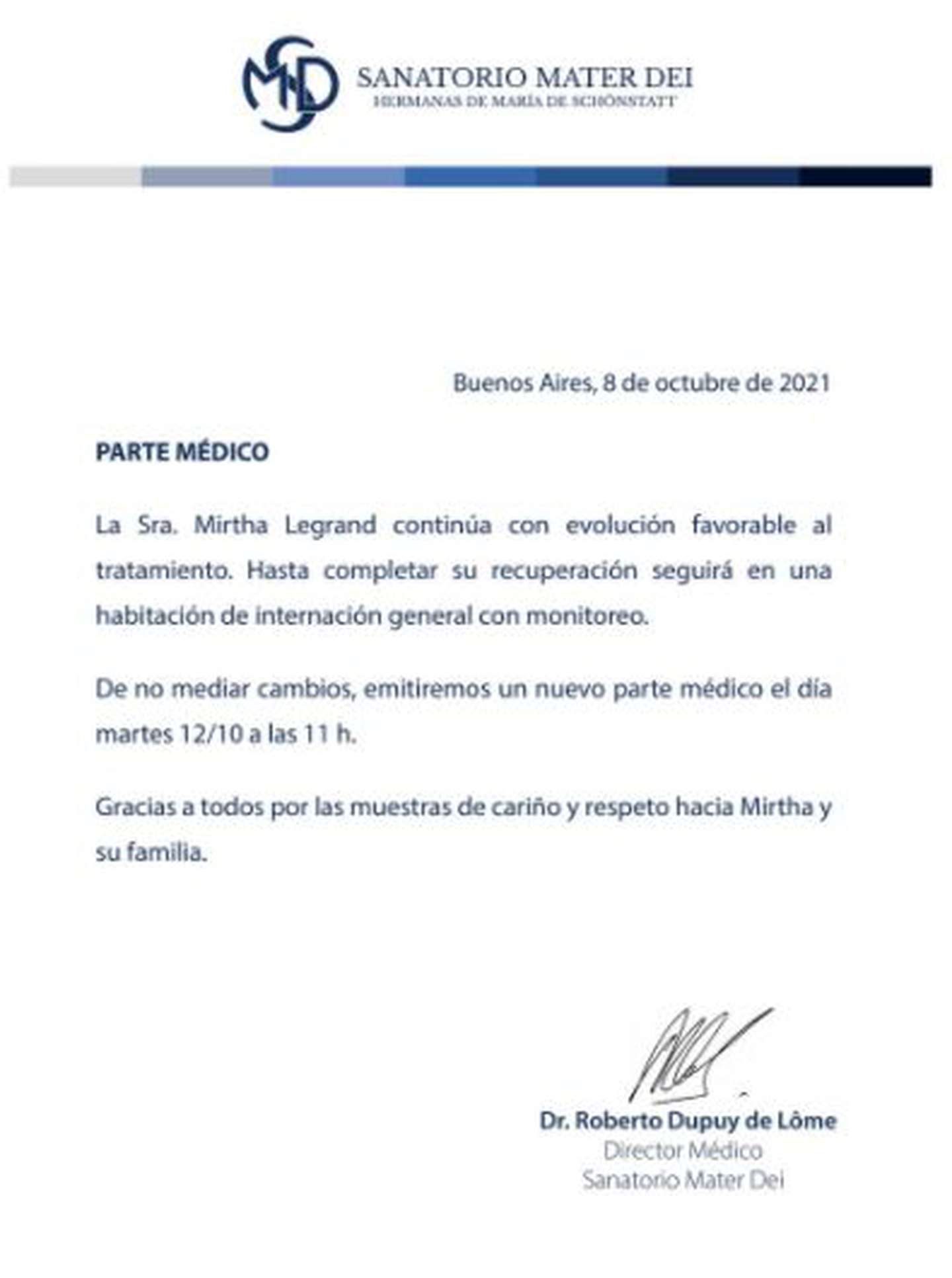 "De no mediar cambios, emitiremos un nuevo parte el día martes 12/10 a las 11", avisaron, además, en el escrito. Y cerraron: "Gracias a todos por las muestras de cariño y respeto hacia Mirtha y su familia".