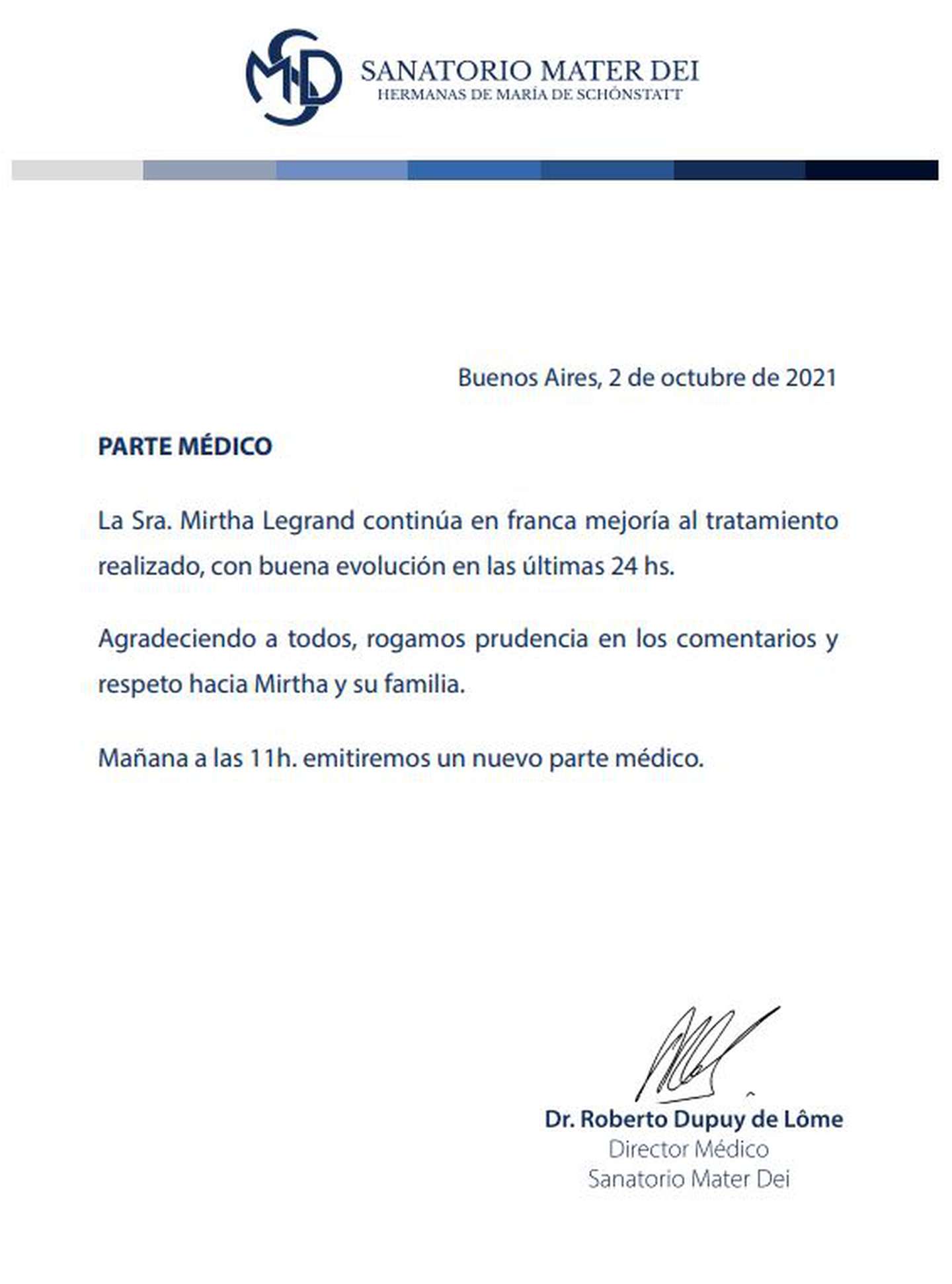 Este sábado se conoció un nuevo parte médico que informó que sigue evolucionando favorablemente. “Continúa con franca mejoría al tratamiento realizado”, señalaron.