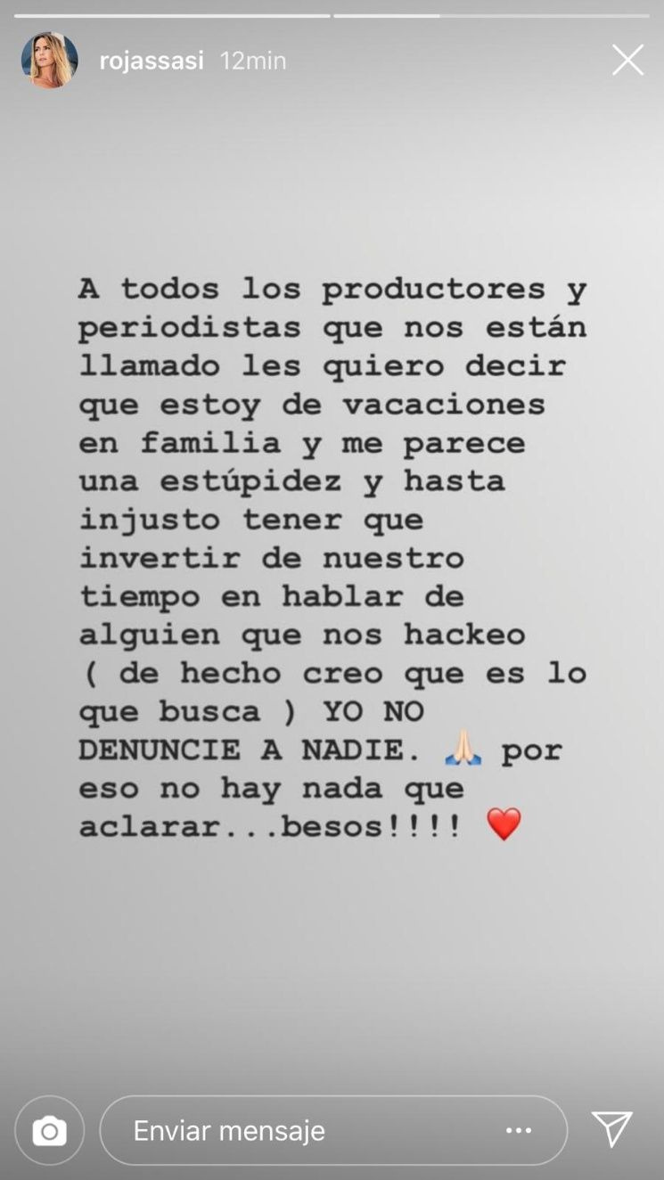 El miércoles a la mañana, la rubia volvió a escribir al respecto: "A todos los productores y periodistas que nos están llamando les quiero decir que estoy de vacaciones en familia y me parece una estupidez y hasta injusto tener que invertir nuestro tiempo en hablar de alguien que nos hackeó (de hecho creo que es lo que busca). Yo no denuncié a nadie. Por eso no hay nada que aclarar… besos!!".