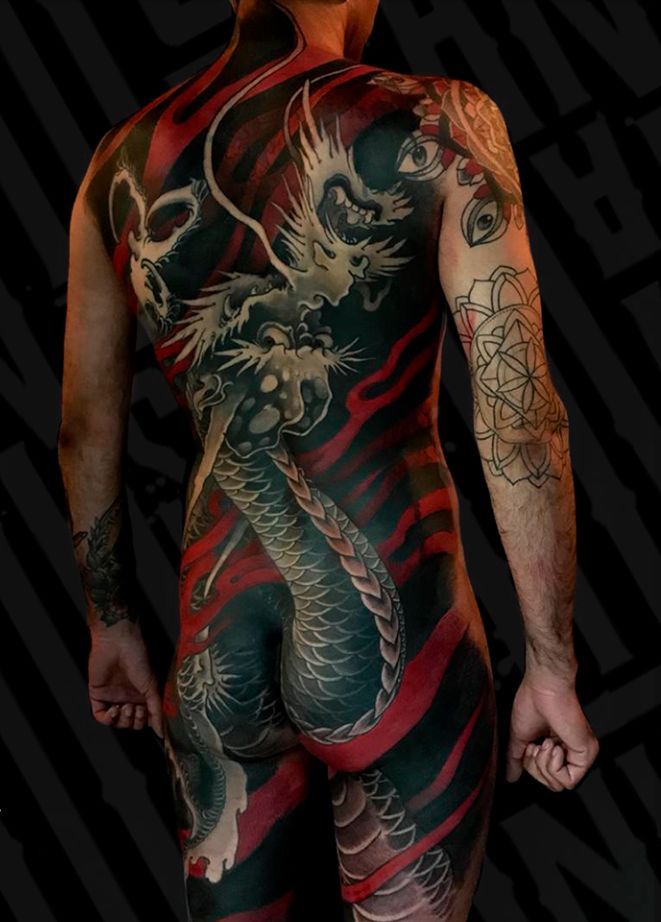 – Porque el dragón es una figura poderosa, es el rey de toda la iconografía japonesa. Es una criatura mística, el elemento más importante que hay. Además, somos muy fanáticos. Dibujar una espalda entera nos hace sentir bastantes seguros de nuestro trabajo y eso nos da confianza en lo que hacemos. Cuando una persona nos cede su cuerpo, su piel o su espalda entera, para hacer nuestras locuras es algo que nos fortalece.