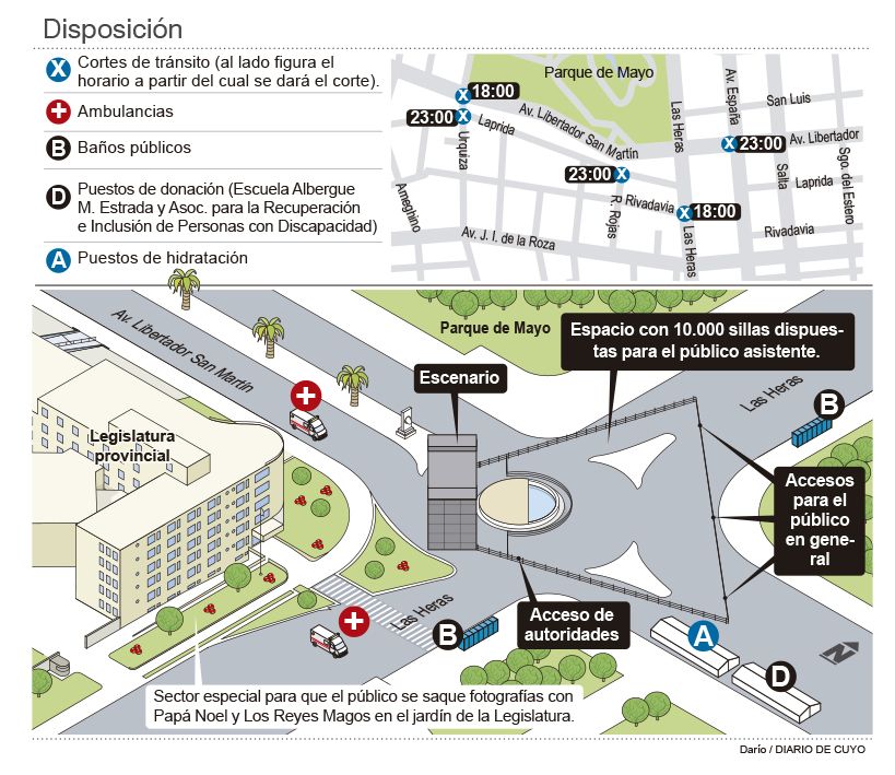 Hoy, desde las 18 hs, la avenida Libertador entre Urquiza y Las Heras quedará inhabilitada para el tránsito en una mano (de oeste a este), como así también el sector de Las Heras y Rivadavia. Y a las 23 hs de esta noche, quedará cortada Av. Libertador entre España y Las Heras (de este a oeste) y Laprida desde Urquiza hasta Las Heras. Además, todos los accesos quedarán interrumpidos al tráfico la noche de la función y hasta la mañana del domingo.