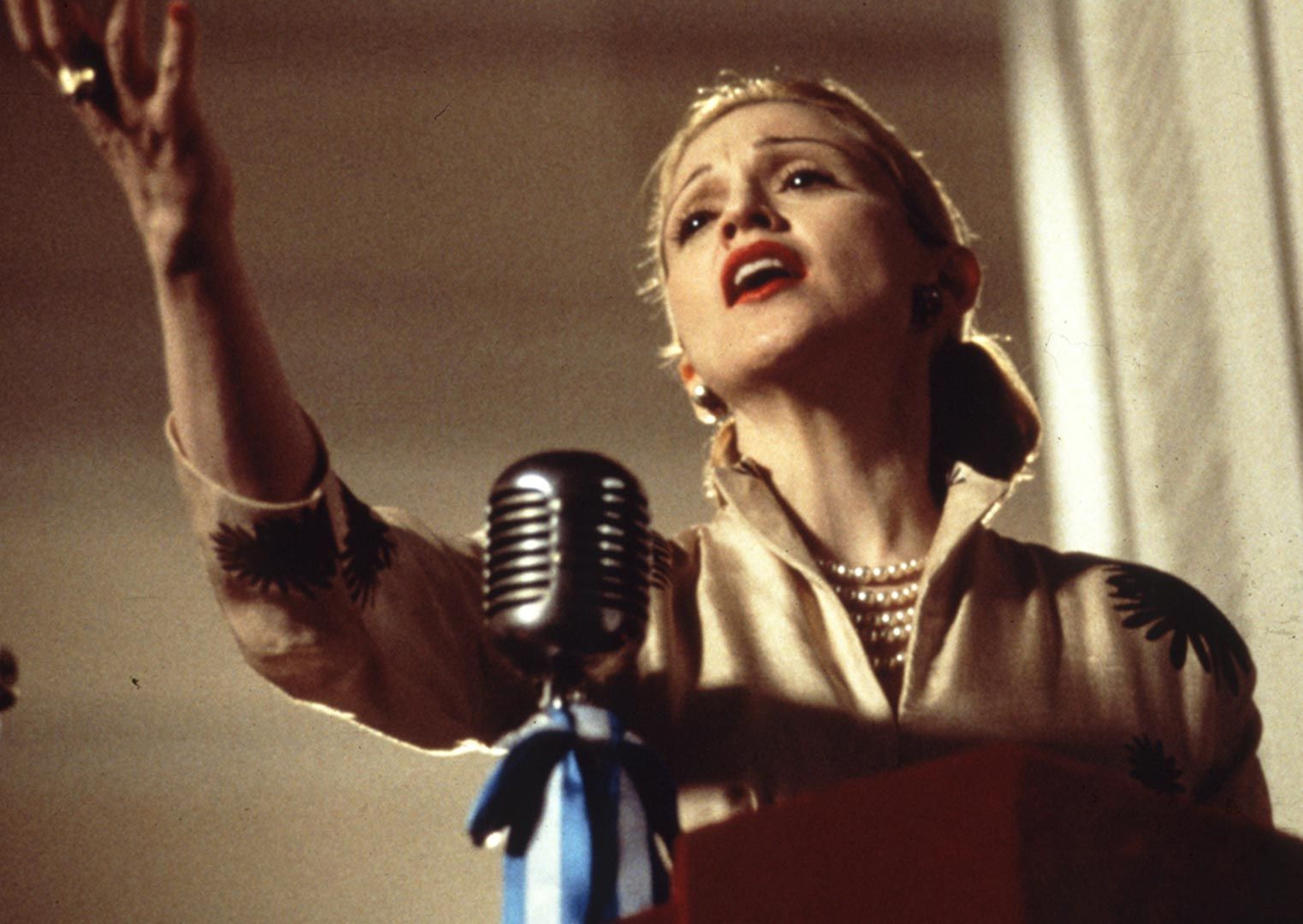 Opera rock de Andrew Lloyd Webber y Tim Rice, dirigida por Alan Parker y filmada en Argentina. Madonna encarnó a "la abanderada de los humildes" (Jonathan Pryce fue Perón y Antonio Banderas, el Che Guevara) en esta superproducción. A partir de su muerte en 1952, recorre desde la infancia difícil de Eva hasta convertirse en primera dama.