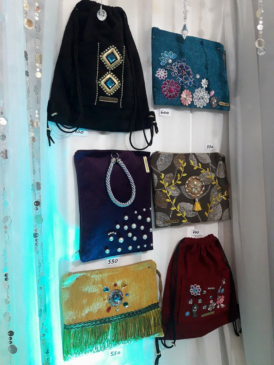 Los clutches (sobres) y mochilas de Silvina Pagés debutan en la Feria de Artesanías. Producto local realizado con géneros como pana, brocato, chenille y jacquard, están decorados con bordados y apliques, utilizando perlas, galones, pedrería y bisutería, entre otros. De finas terminaciones, pueden complementar con guantes intervenidos. Los precios de los guantes son de $250 y 350, mientras que los sobres y mochilas llegan hasta $700.