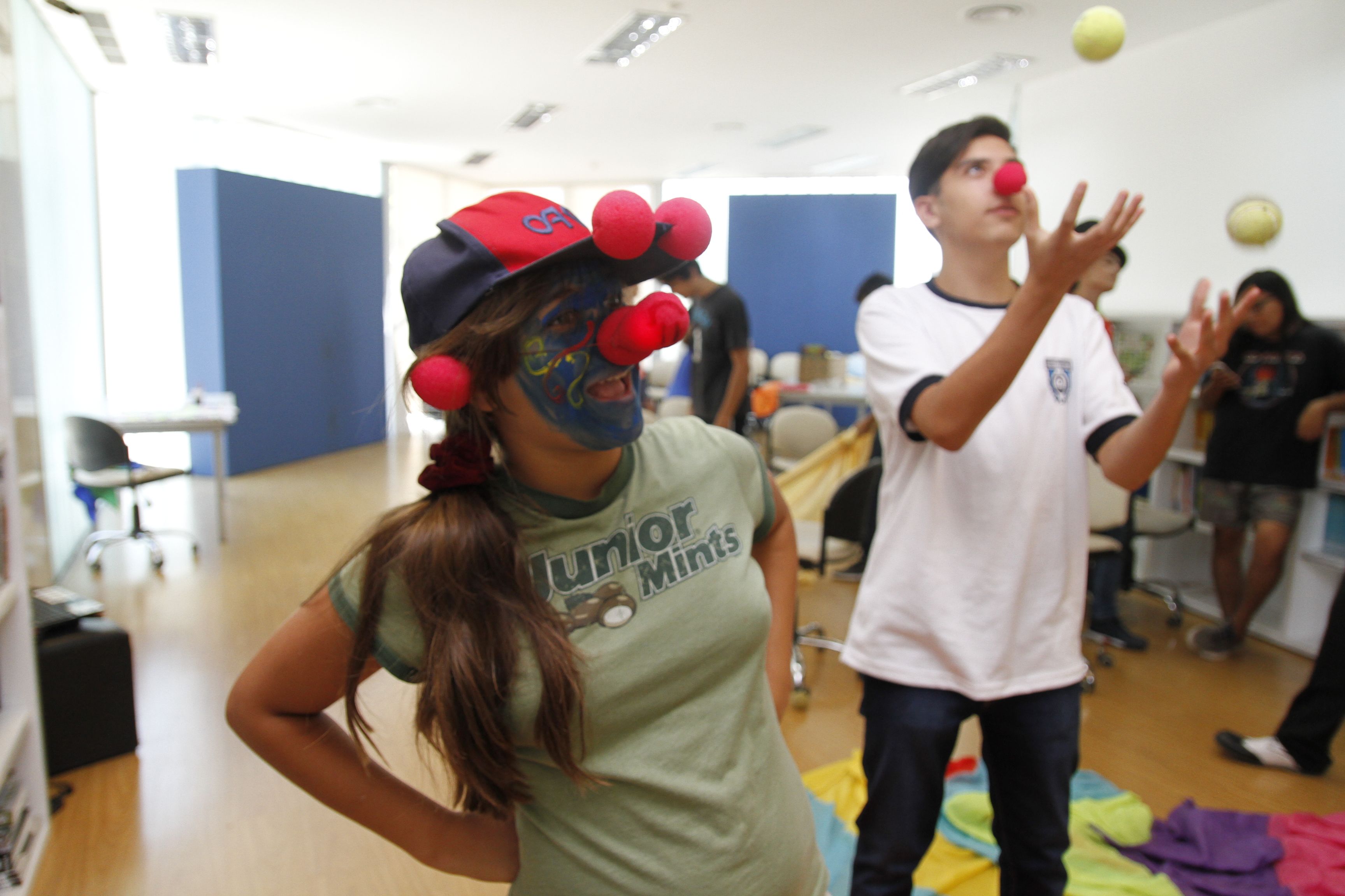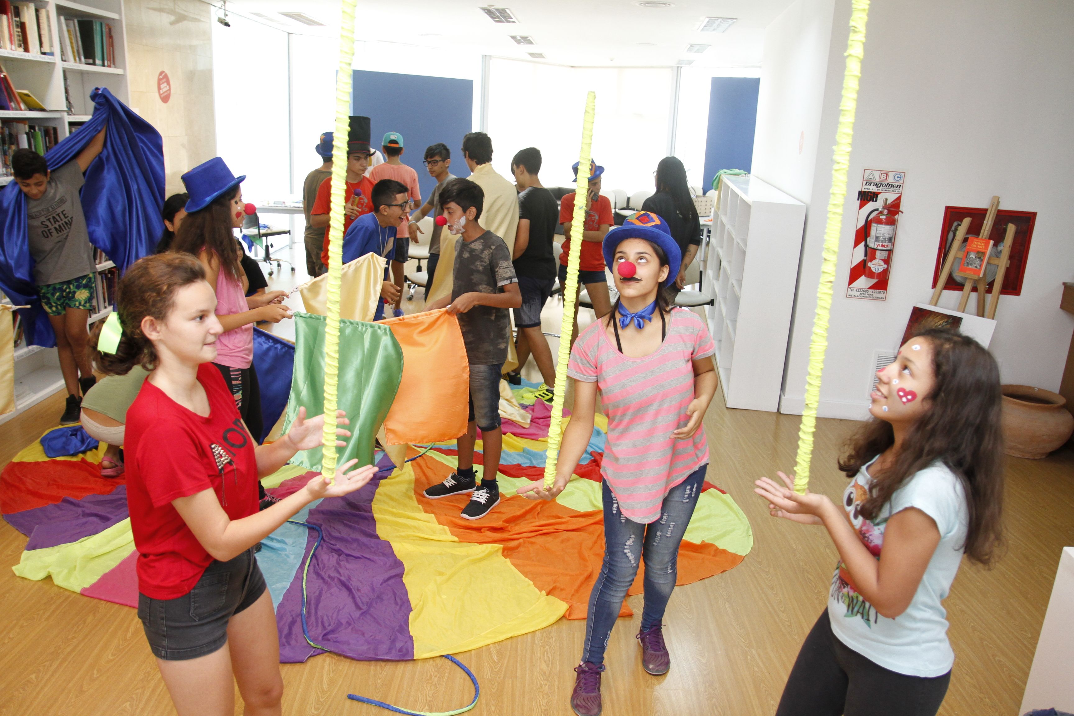 Un gran paño multicolor en el suelo, simula la arena de un gran circo, donde payasos, mimos, malabaristas, magos y equilibristas entran para hacer reír y repartir alegrías al público. En este juego imaginario, los chicos y adolescentes aprenden no solo las disciplinas tradicionales del entretenimiento circense, sino que lo más primordial, desarrollan la igualdad, la participación, la creatividad y no menos importante: perder la vergüenza. Así son los días del nuevo taller de artes circenses, uno de los tantos (son doce) que se practican en el Vacacionarte. En el marco de los 10 años de existencia de la colonia artística que organiza todos los veranos el Museo de Bellas Artes Franklin Rawson, el eje o leit motiv que cruza a todas las actividades, es ‘la celebración’. Es en esta experiencia, donde la expresión pura es el común denominador para todas las edades, donde los pequeños entusiastas, sacan el payaso que llevan dentro. El taller, es coordinado por Alcira Núñez y Luis Cravero, juntos llevan la tarea de ordenar un poco las consignas y las tareas, el resto corre por cuenta de los jóvenes. ‘Tienen muchas ganas de divertirse. Todo lo hacen de manera colectiva y además, no discriminan a nadie. Acá no diferencian los niveles cognitivos o sociales, se integran plenamente’, dijo el profesor. Una de las claves, es que comparten todo, hasta la merienda. Facundo Gutiérrez, quien por primera vez participa del Vacacionarte, le ha fascinado todo el mundo del mimo: ‘cuando tuve un problema en el corazón, conocí un mimo y me hizo reír tanto que desde entonces quise aprender todo sobre este arte’. Nicole Doncel, es la más inquieta del grupo, cansada que sus vacaciones de verano fueran monótonas y aburridas, descubrió su lugar dentro de la colonia y ahora es quien divierte a todos con sus ocurrencias: ‘Hago payasadas y me salen muy bien. Compartimos chistes, bromas y siempre pinto la cara a los demás’, contó con su carita toda pintada de azul y una nariz roja luminosa.