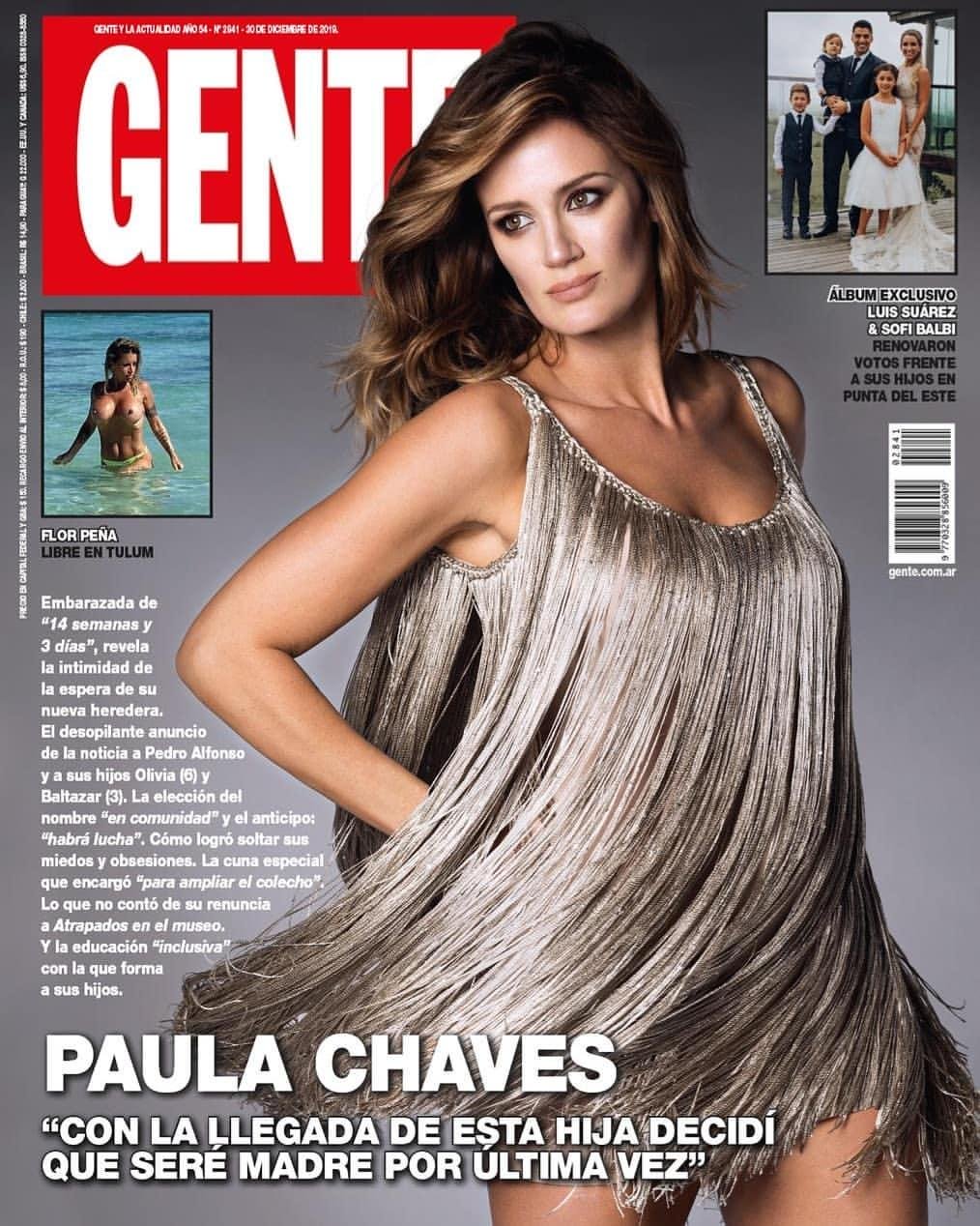 "Con la llegada de esta hija decidí que seré madre por última vez", comunicó Chaves en la portada de la revista y, de esta manera, informó que se trata de una niña. "Embarazada de 14 semanas y 3 días, revela la intimidad de la espera de su nueva heredera. El desopilante anuncio de la noticia a Pedro y a sus hijos Olivia y Baltazar", se ve escrito en la portada.