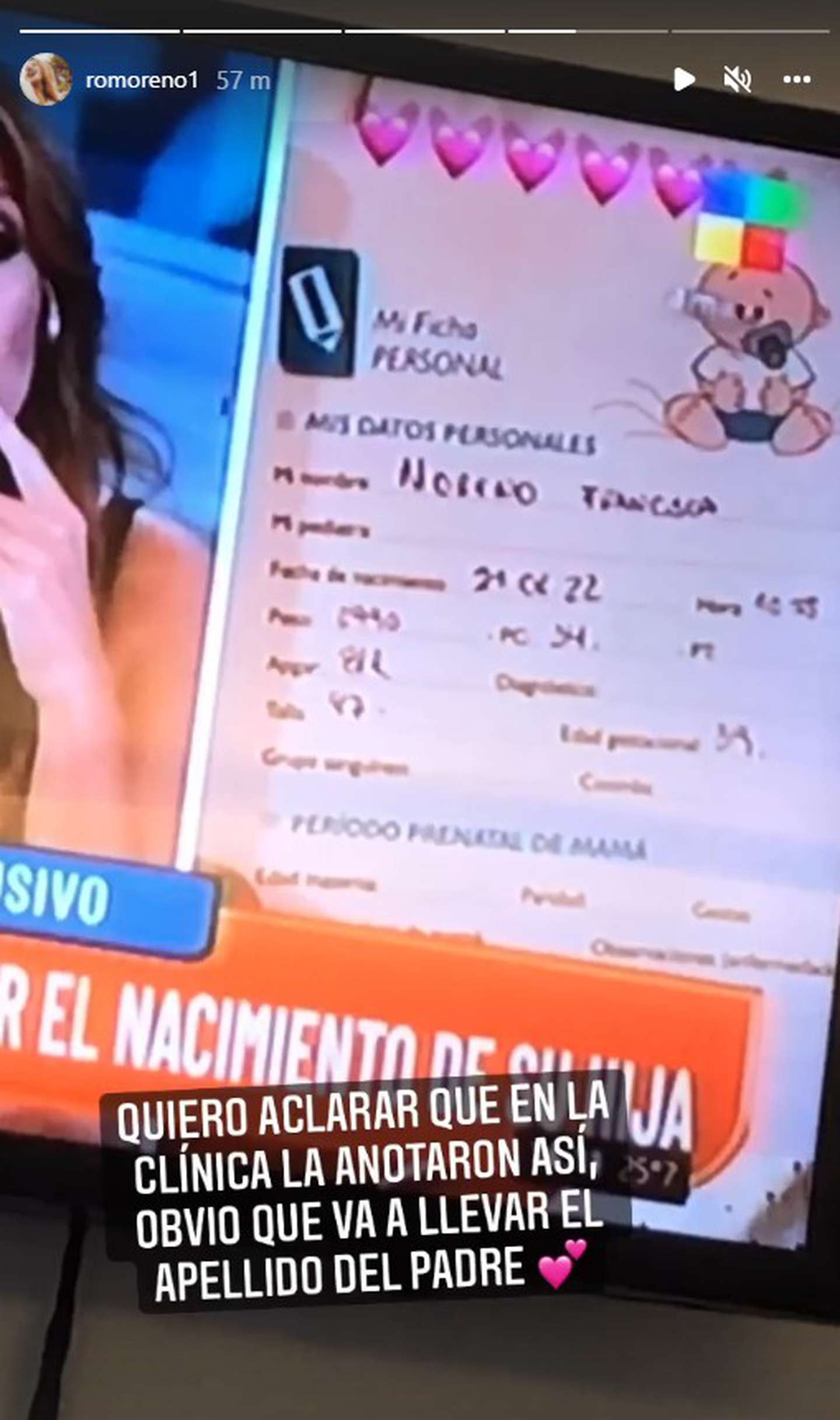 Ellos no se mostraron juntos todavía y no se sabe si pudieron recomponer el vínculo amoroso. Por lo pronto, lograron calmar las aguas y recibieron a su segunda beba juntos. Ante las dudas que generó la situación y con una ficha de la nena que muestra a Francisca con el apellido Moreno, fue la misma Rocío la que confirmó que su hija llevará el apellido Londra.