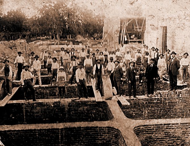 Hombres posando sobre piletones de la Bodega Graffigna, en una fotografía tomada alrededor de 1920, brindada por Danisa Amarfil.
