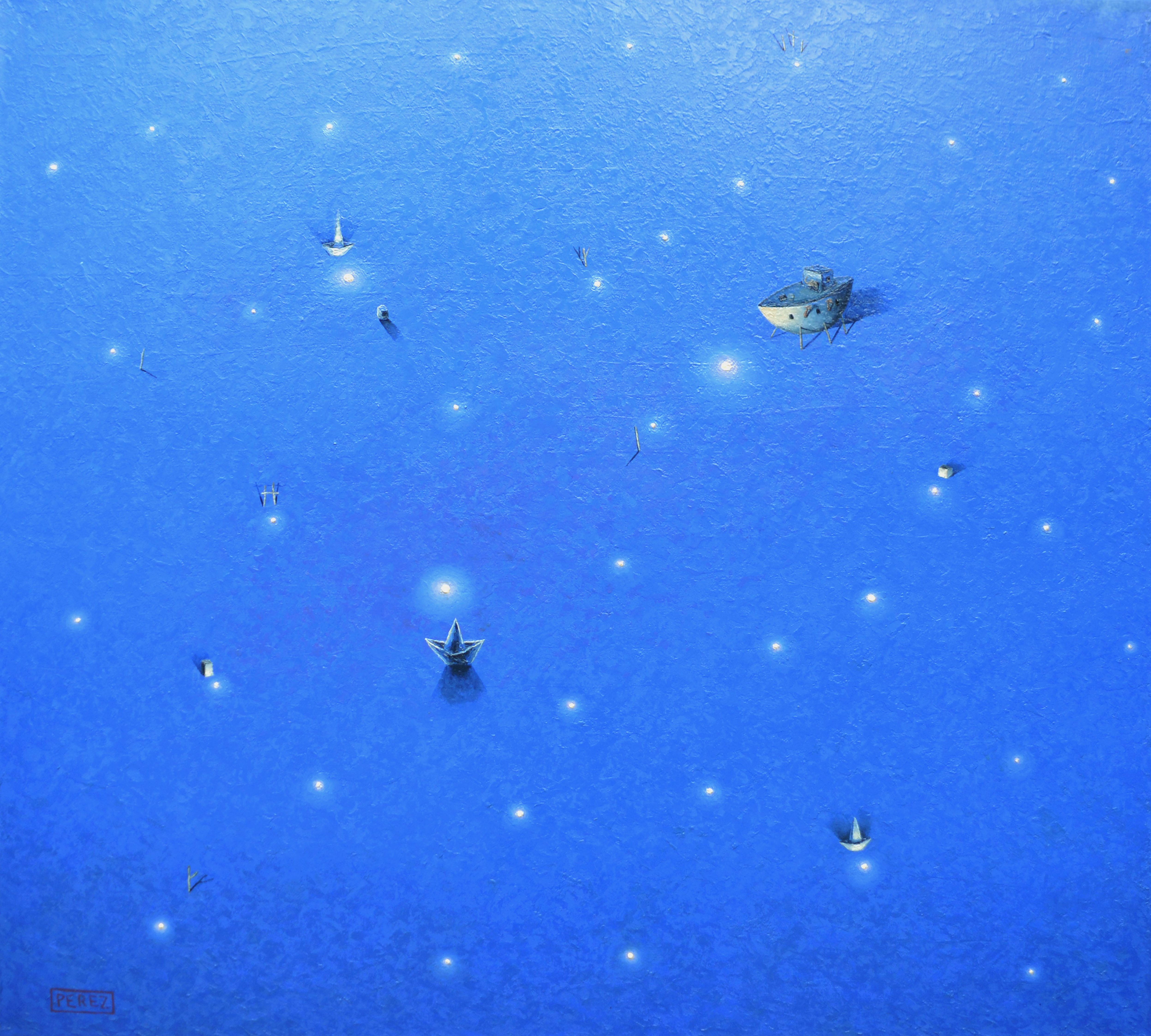 Según manifestó Pérez ese es su mundo. "Uno se hace conocido por una imagen, una paleta y la repetición. Voy a quedar en la retina. Yo hago barquitos, arcas, los espacios conceptuales azules y no voy a salir de ahí", señaló satisfecho a sus 57 años, el artista que volvió a su ámbito luego de sufrir la luxación del hombro derecho en un accidente casero en 2017, lo que le imposibilitó su tarea por varios meses y postergó la exhibición.