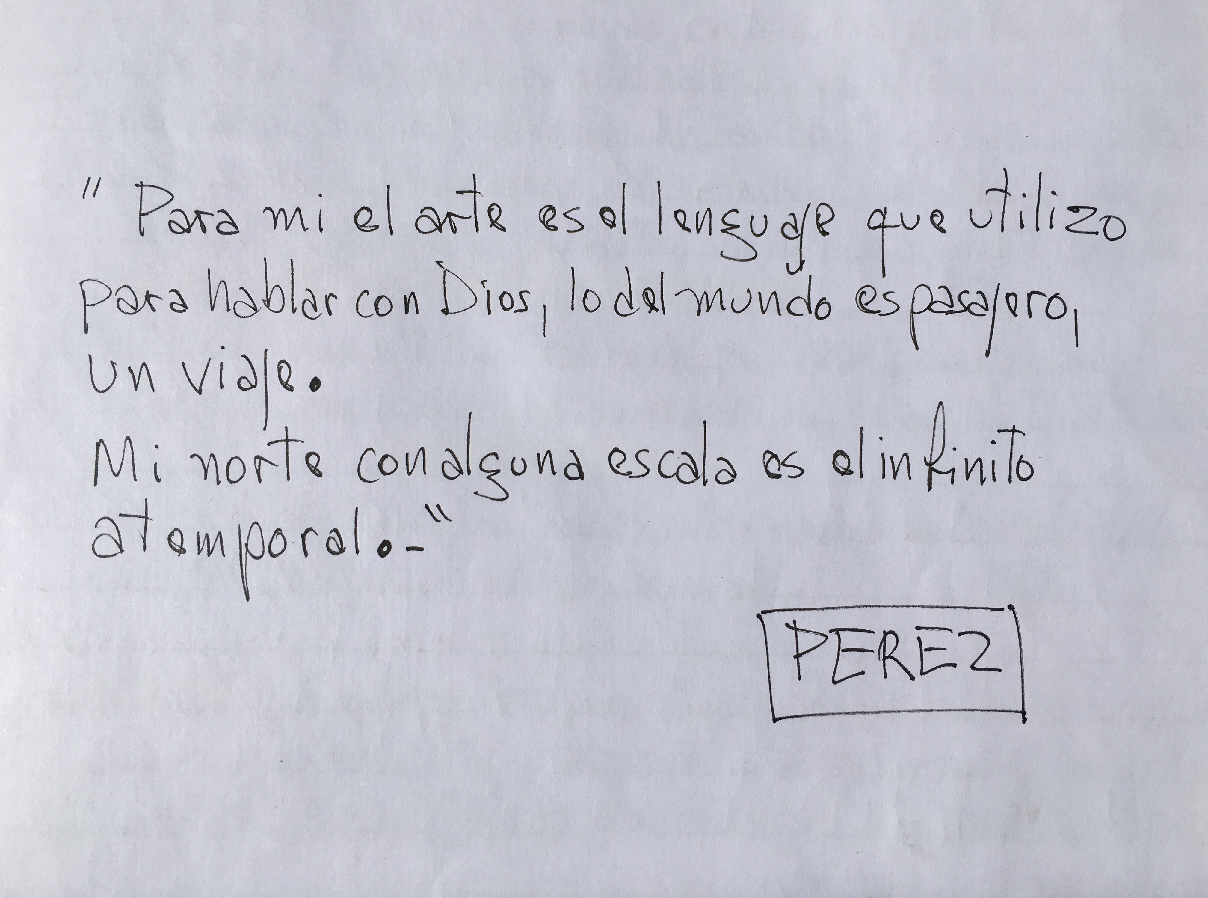 "Pérez ha legado a San Juan y al mundo, un inmenso corpus de obras de excelente calidad artística que enriquecen el patrimonio cultural universal. Entre otras cosas, ha dejado para las futuras generaciones, la enseñanza de lo que se consigue con el esfuerzo continuo y sistemático, y la pasión con que se cultiva una profesión".