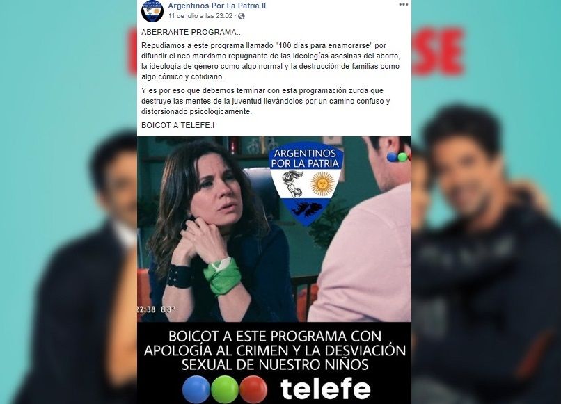 Un grupo de Facebook llamado “Argentinos por la patria II” publicó un extremo comunicado en el que pide que saquen del aire el programa “100 días para enamorarse” que se emite por Telefe.